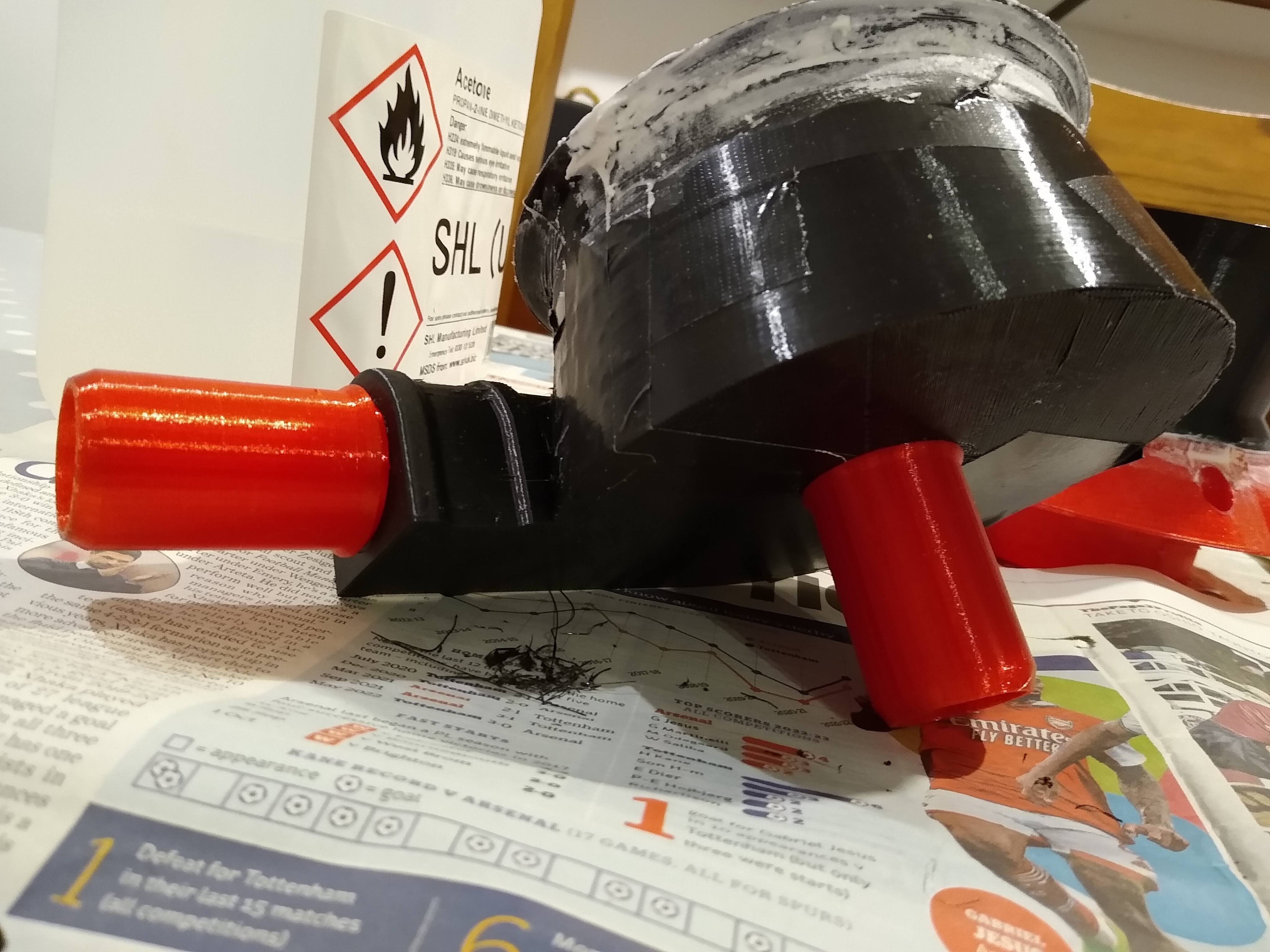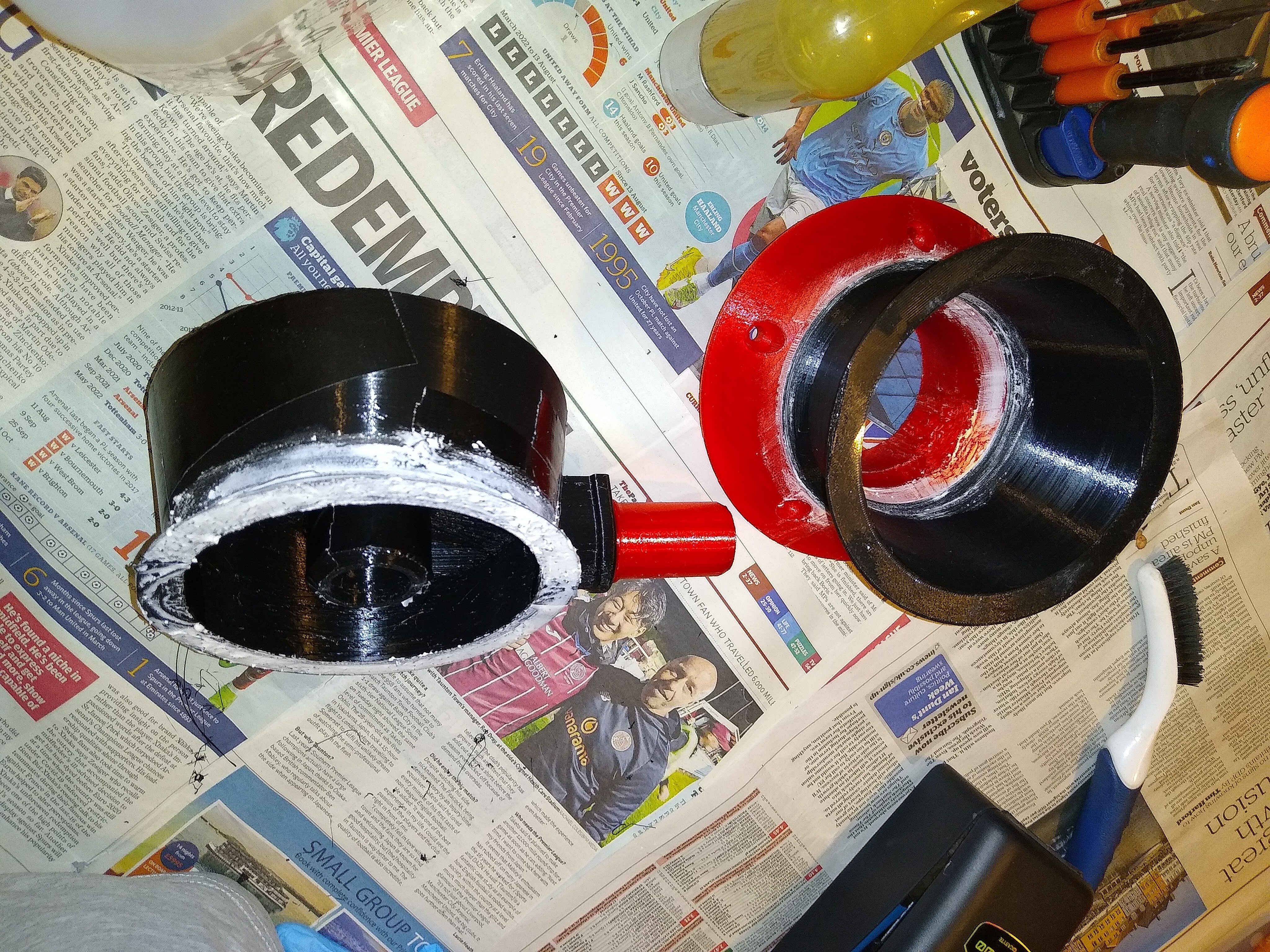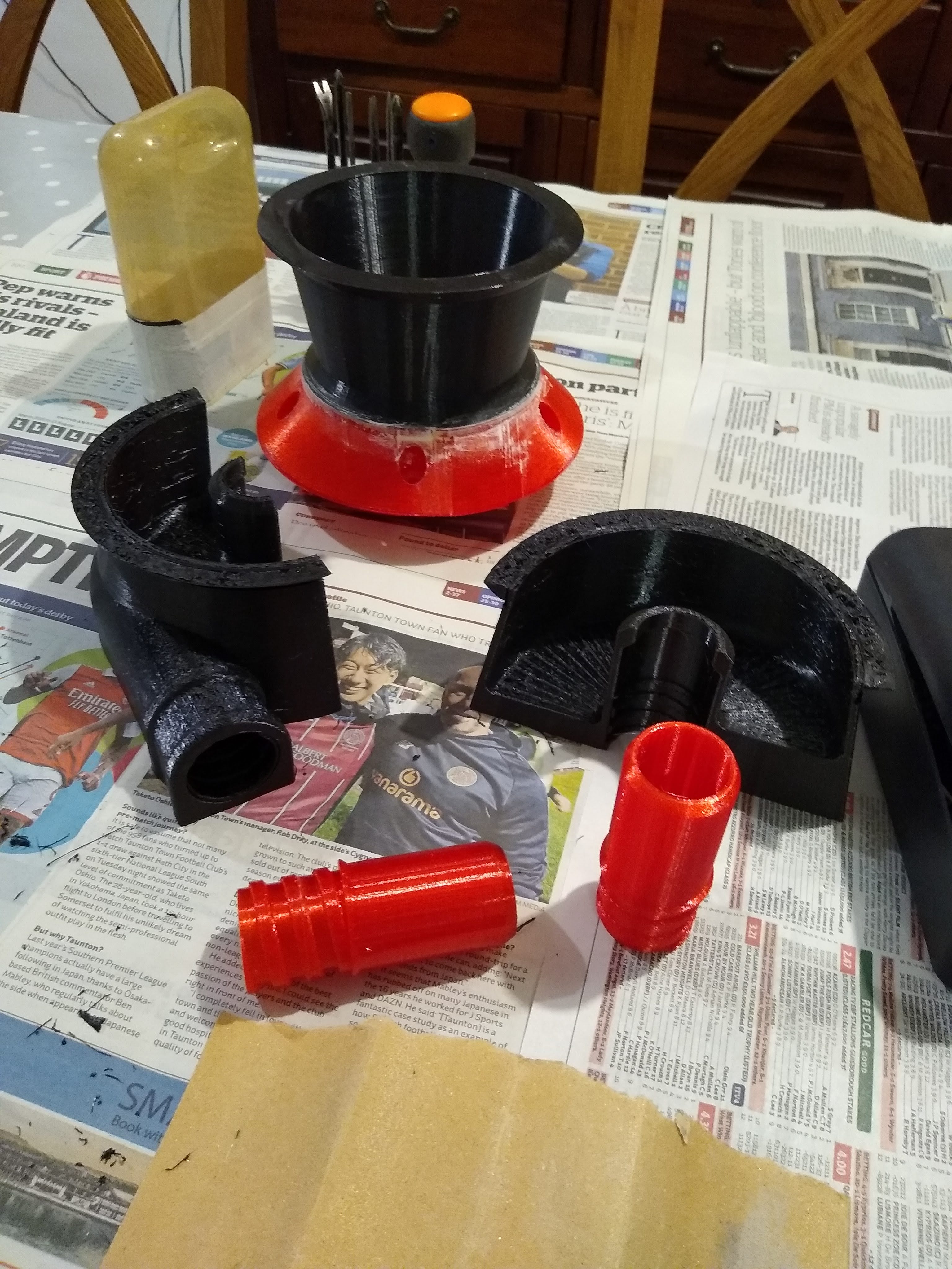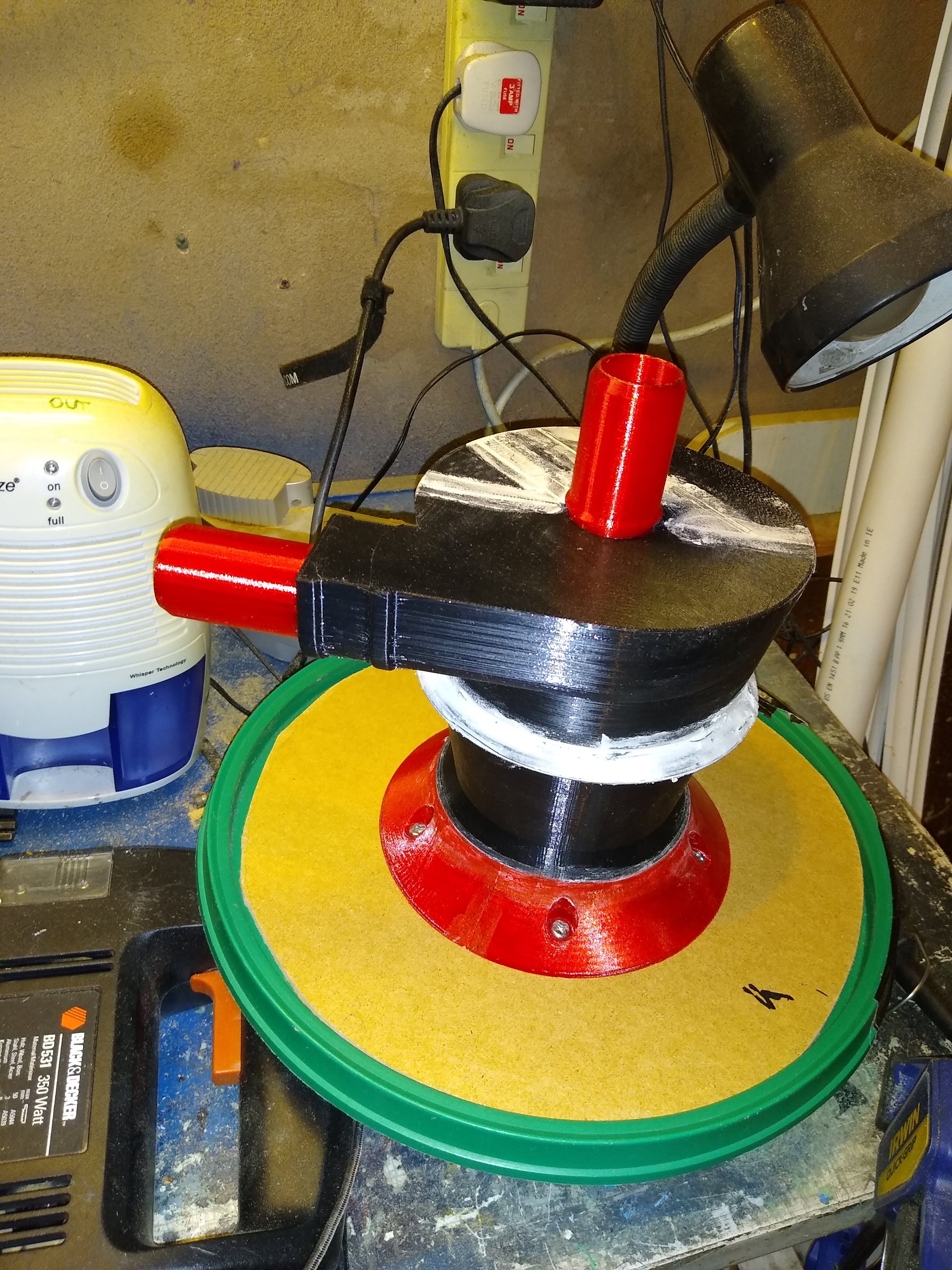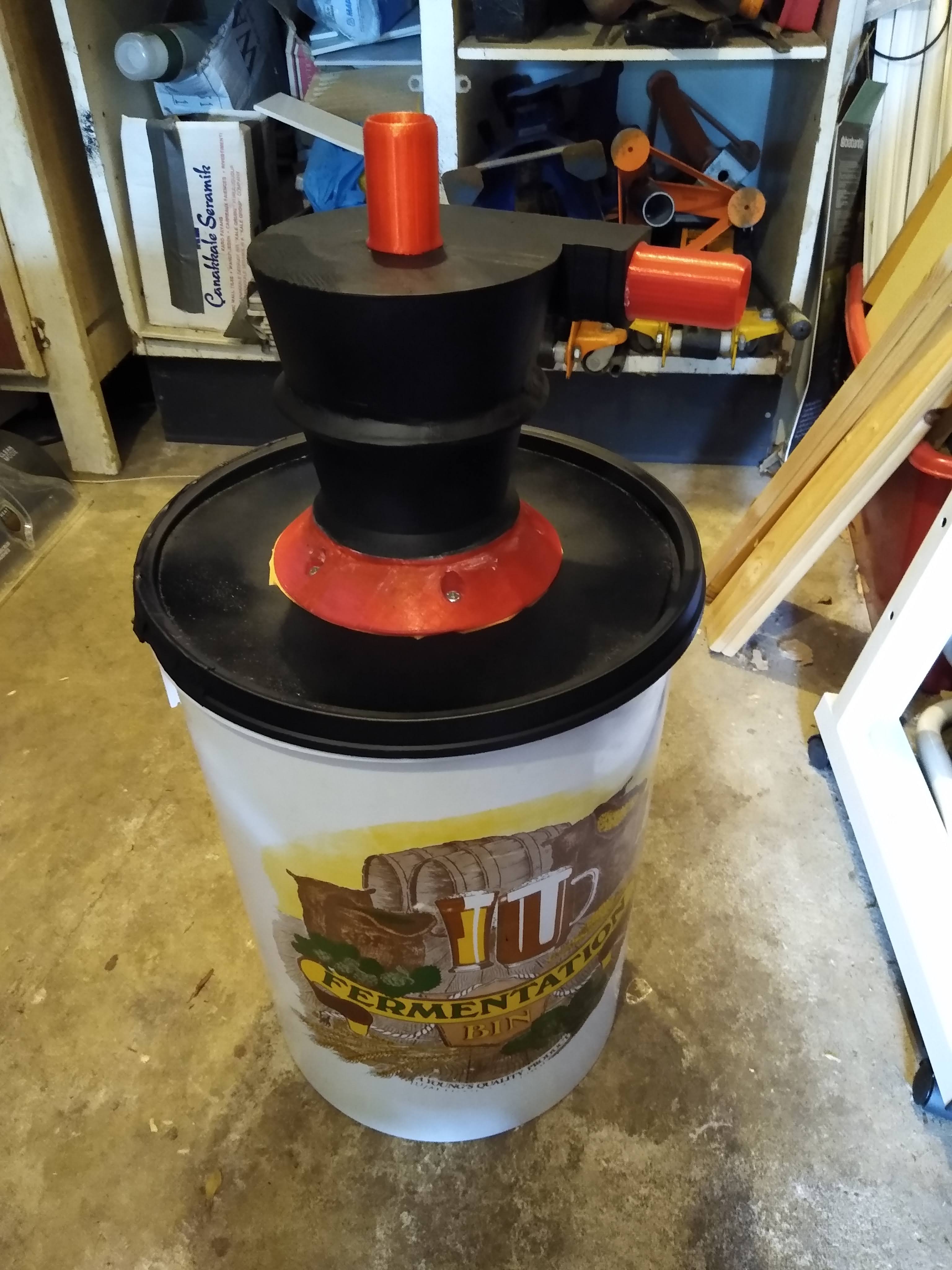 After everything had been printed it needed to be glued together and a few gaps had to filled. After a lick of paint and attaching it to an old fermentation bin lid the sawdust collecting bin was complete. A few pics of the process: