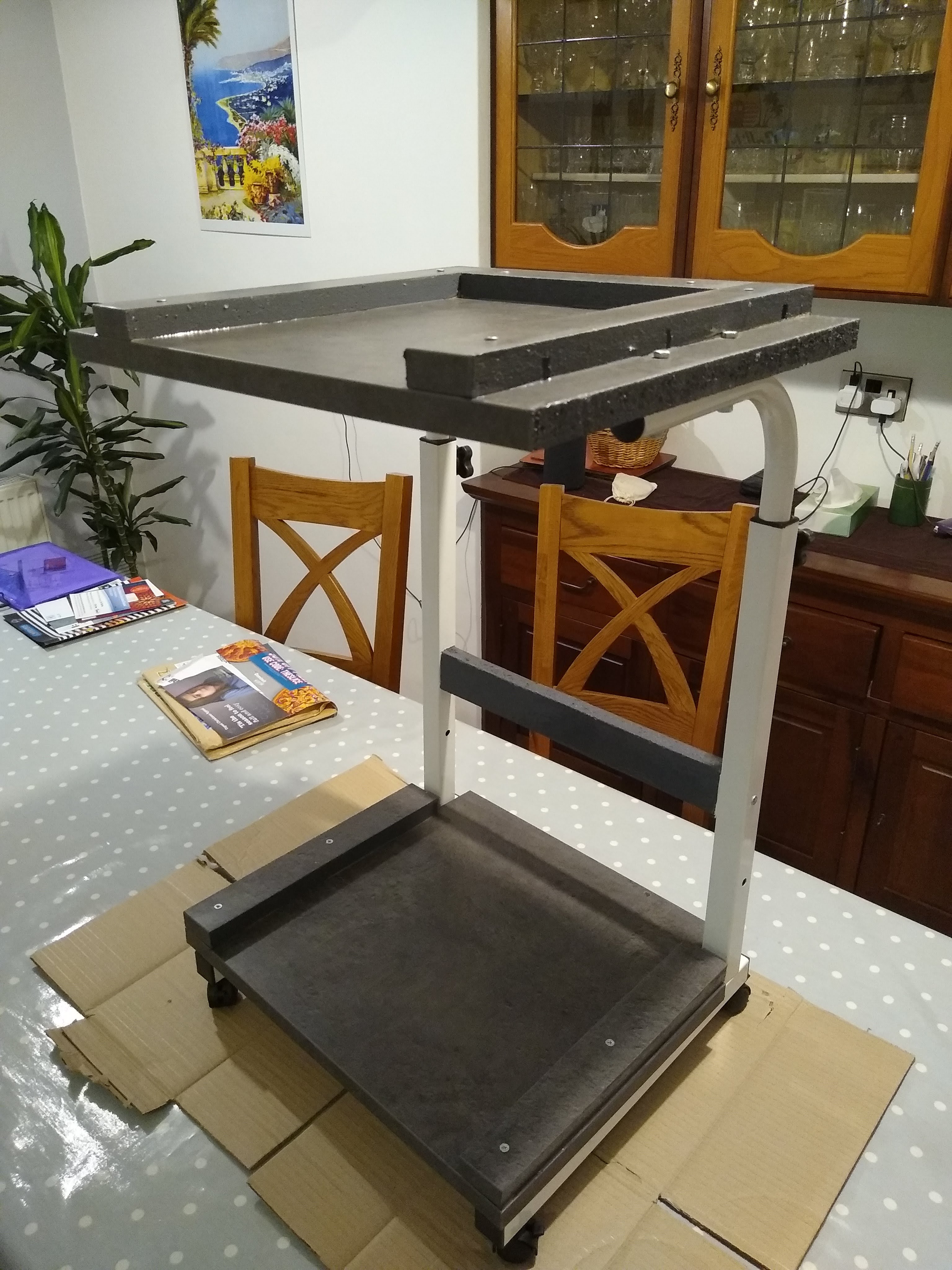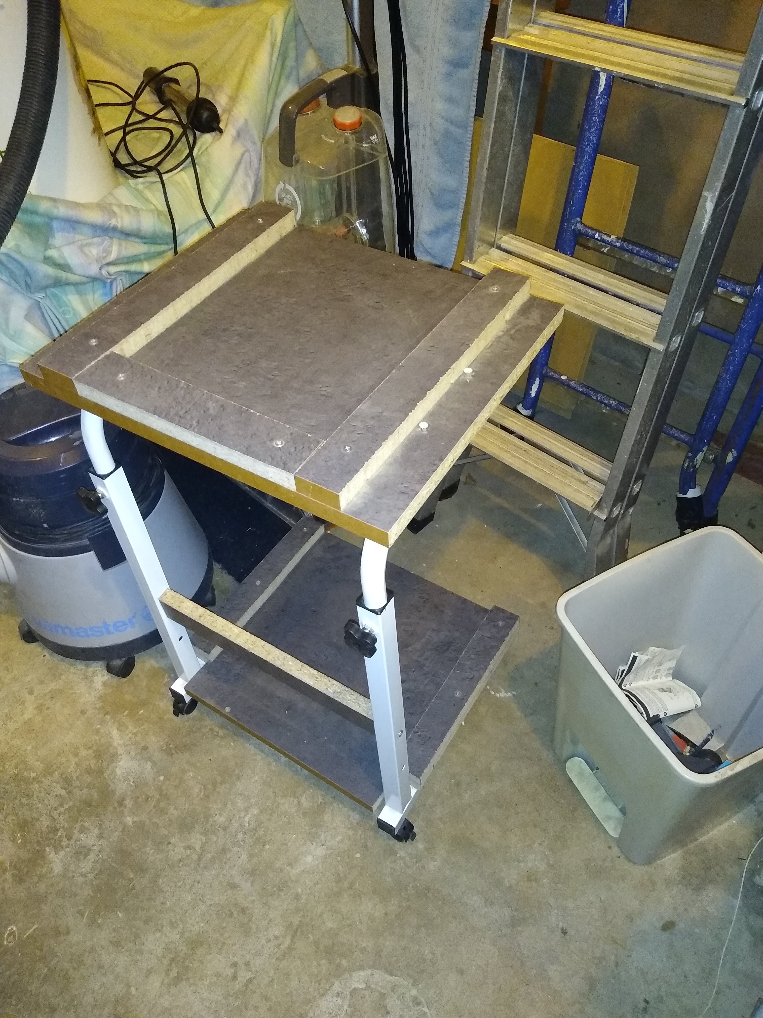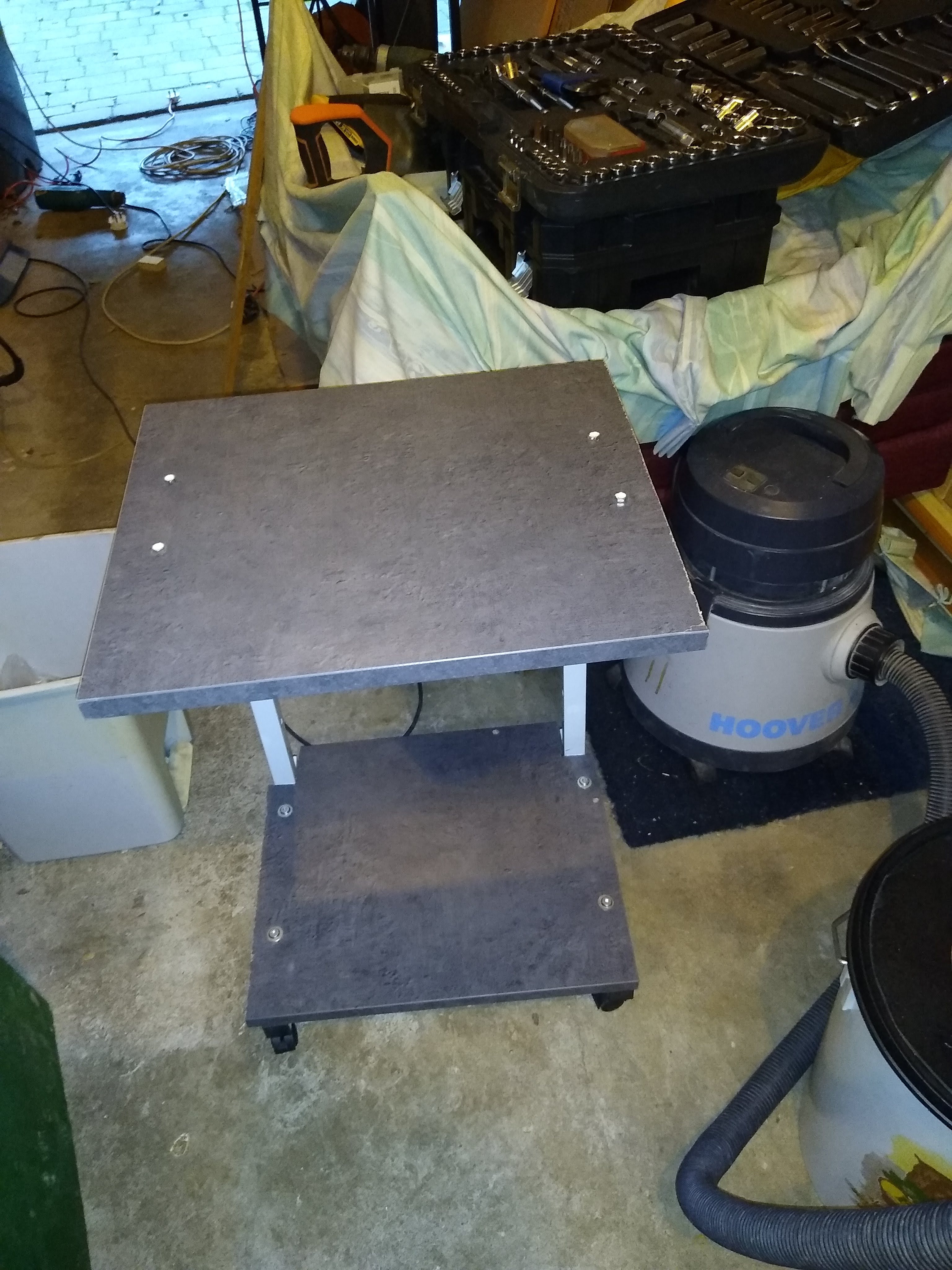 The next step was to make a trolley to fit the hoover and the collection bin. This basically involved cobbling together some mdf and old legs from a desk of some sort. It wasn’t pretty but it kinda worked.