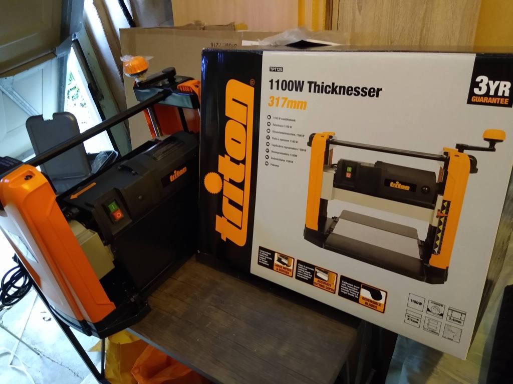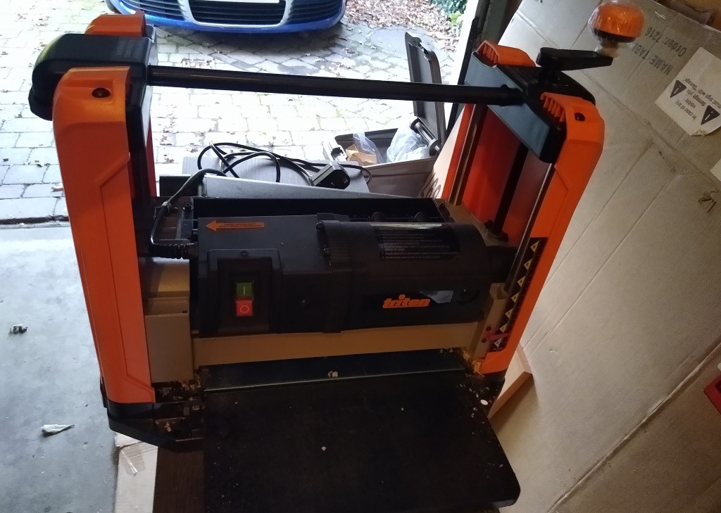 Step 1: Prepare the wood for gluing together. This involved planing the face of each side of wood then ripping each piece in half. I decided fairly early on that I would get a thicknesser and settled on the Triton TPT125. Setting up and using this tool was a piece of cake, however I did learn to properly check the wood for stones and nail remains. I pretty quickly chipped a blade as a buried nail was exposed during a pass. Luckily it was only a tiny chip and all the blades can be flipped over as they are double sided. Later on I invested in a handheld Sealey AK2018 3-in-1 detector, however this proved to be unreliable on small nails. Works great on bigger nails and the voltage detector works. I’m yet to find something better that using my eyeballs.