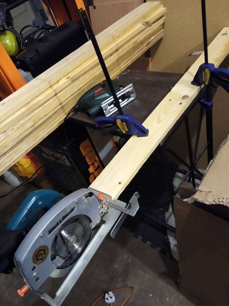 I used circular saw with a guide that was adjusted to cut the wood in half. I quick clamped the wood to a table and flipped the wood at the half way point (as the clamp was in the way). This was sketchy to say the least and I would not recommend it! One day I’ll get a table saw and manifest somewhere to put it.