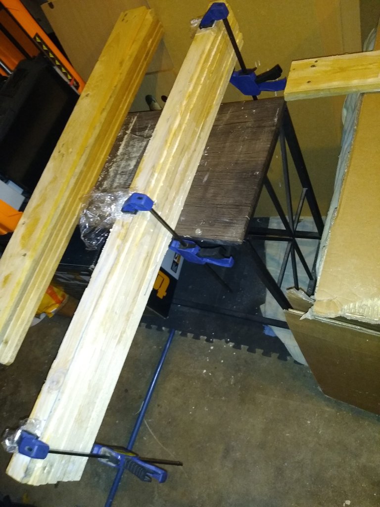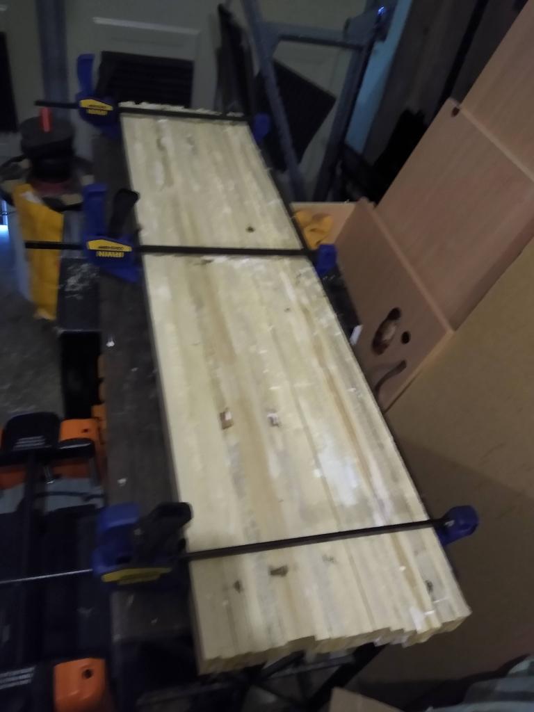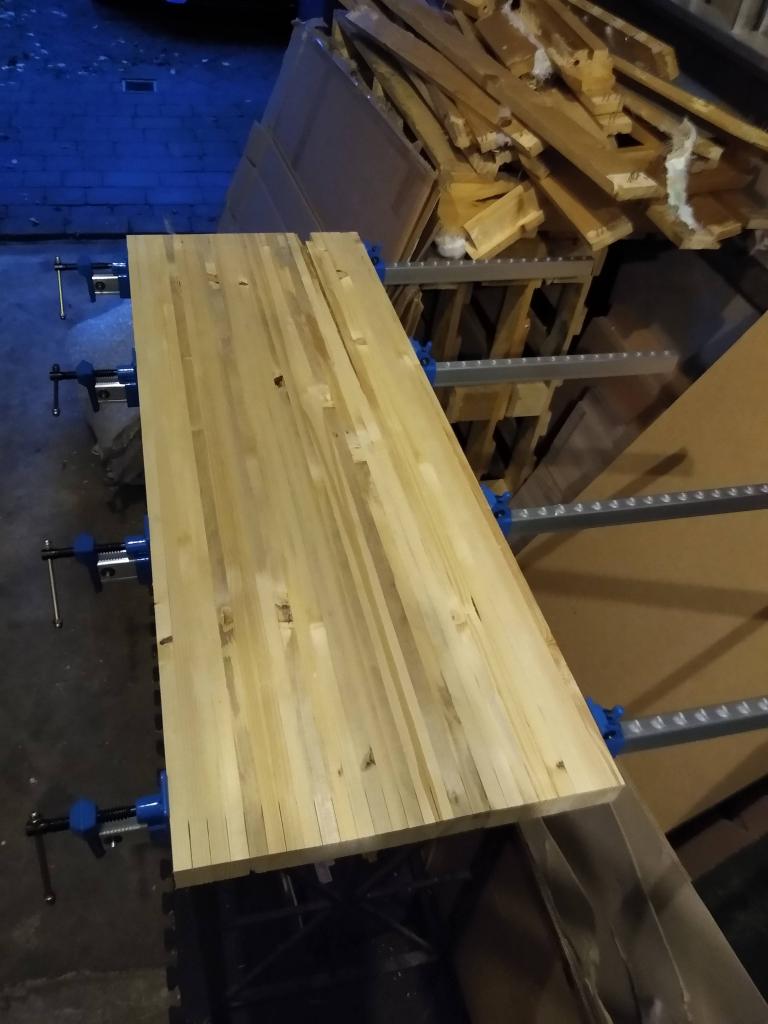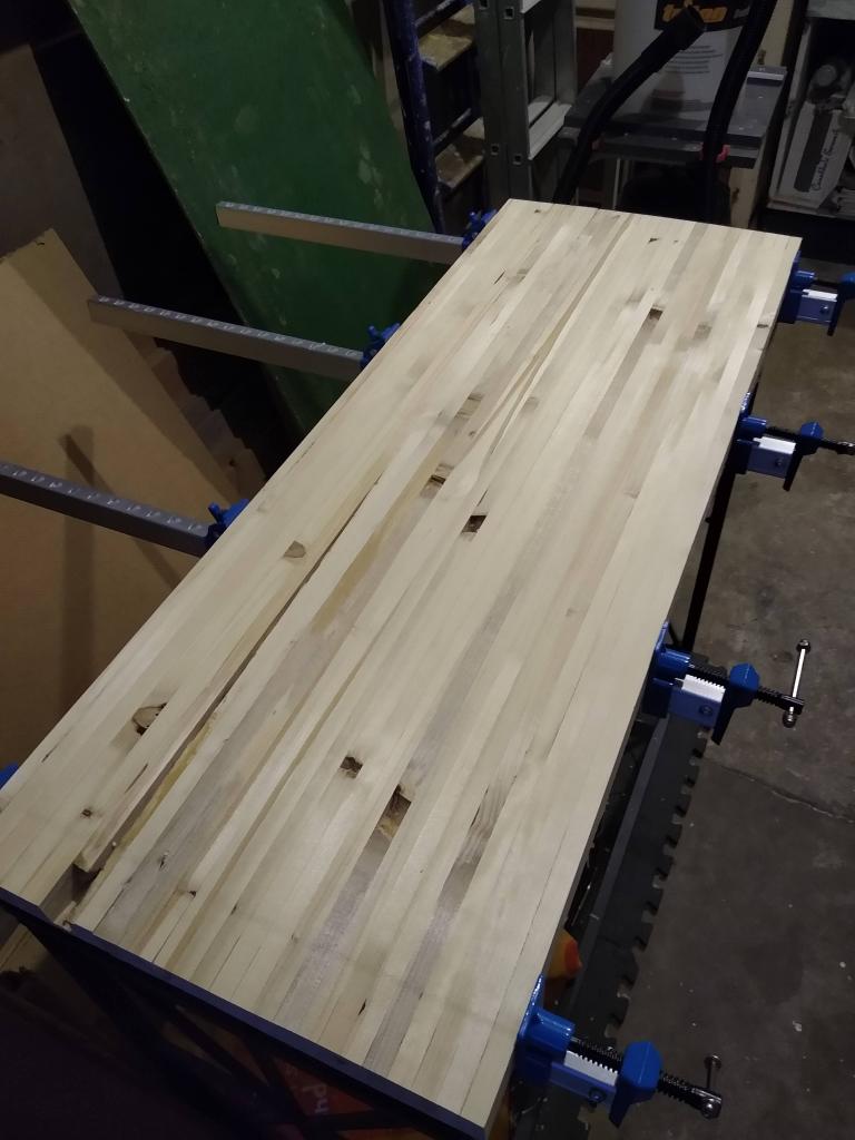 I simply applied BnQ wood glue to each piece of wood and used an old ice scraper to spread it evenly across the whole length of each piece of wood. Then squared them up on the old side table (as it was flat) and applied the quick clamps.