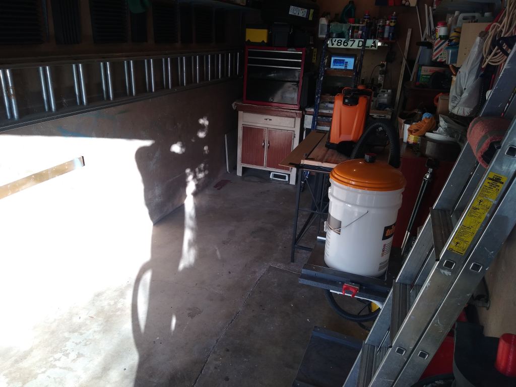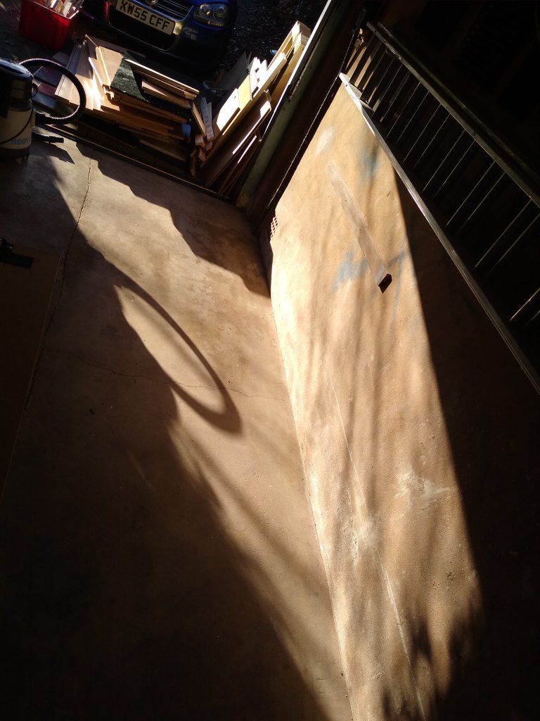 Step 3: Realise how damn loud the thicknesser is and indiscriminately throw acoustic panels up on every spare bit of wall and ceiling. Also, install a weather strip and silicon strips around garage door as water had been getting in under the door. The first batch of foam panels were vacuum packed and reluctant to expand so I had to use the hair dryer technique. The result was that sounds rebounded less than before, so although -DB was probably more or less the same at least it cut out alot of the echo. Sound isolation is something that I will investigate more further down the line.