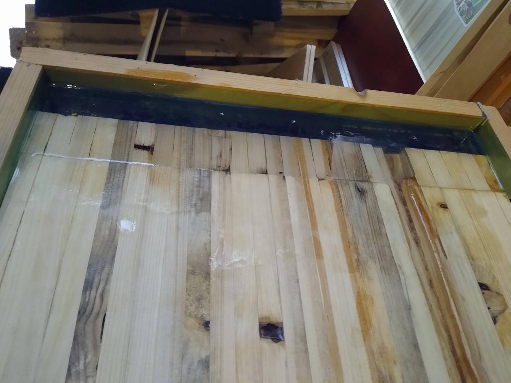 Step 10: Find out my first impression had betrayed me. When I flipped the table over I saw that the epoxy has seeped all across the underside and stuck the hardboard to the table. Next time I will use release tape or release spray on the whole underside.