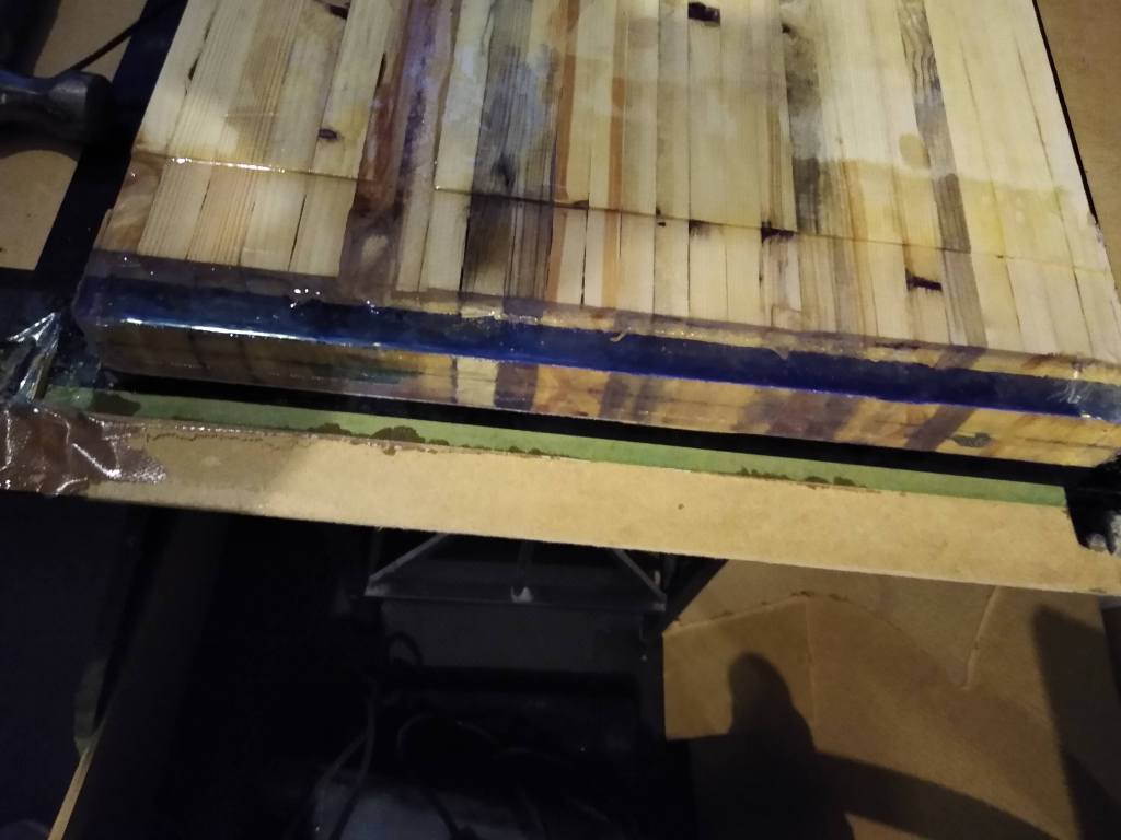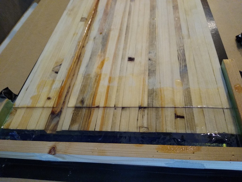 Step 6: After noticing that the ends of the glued-up slats have a slight gap I decided that this could be a good excuse to use some epoxy. Also, there were some bigger voids in between some pieces of wood that epoxy could be used on. This is where things would start to get really messy and complicated.