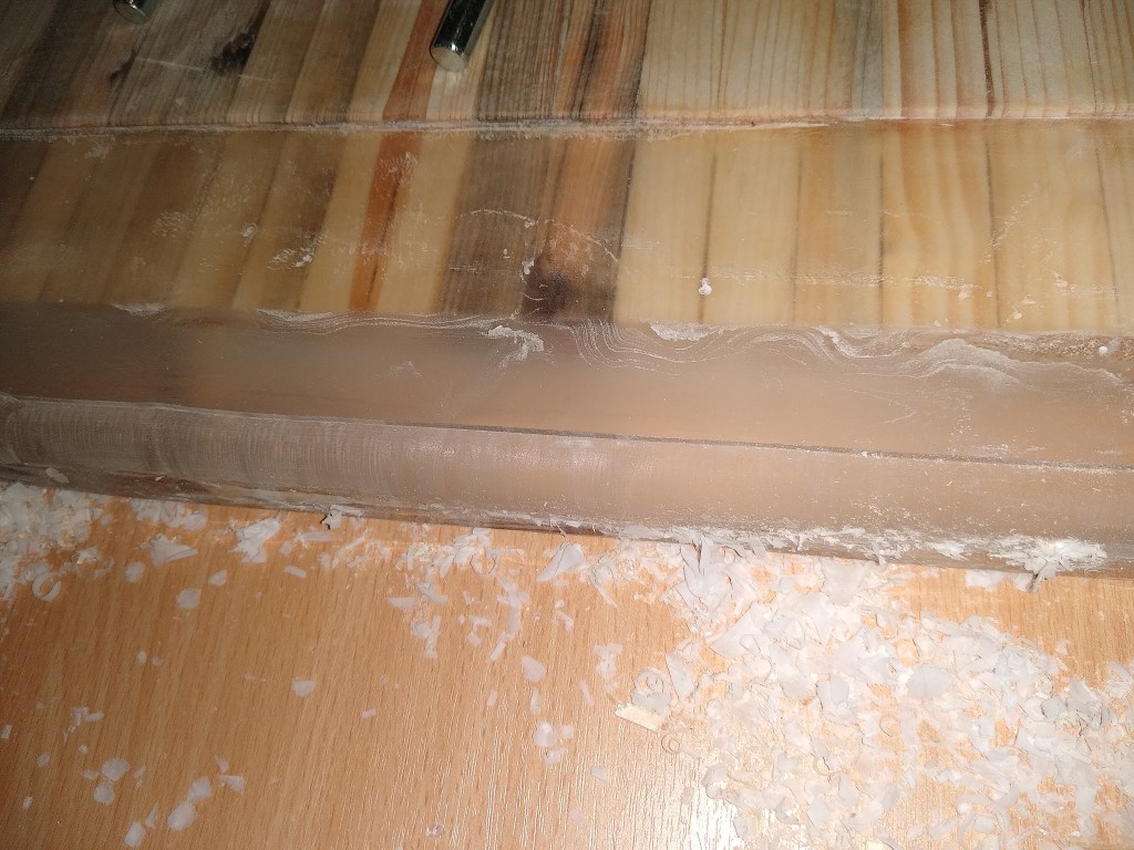 Step 11: After scraping off all the failure from the bottom I realised one end of the table had not cured properly (it was poured at a later time). This was, in part, due to some exceptionally cold conditions in the garage, it was easily below zero overnight which epoxy does not like. After waiting a week it still hadn’t cured (it was gummy) so I decided to cut my losses and scrape/chisel it off.