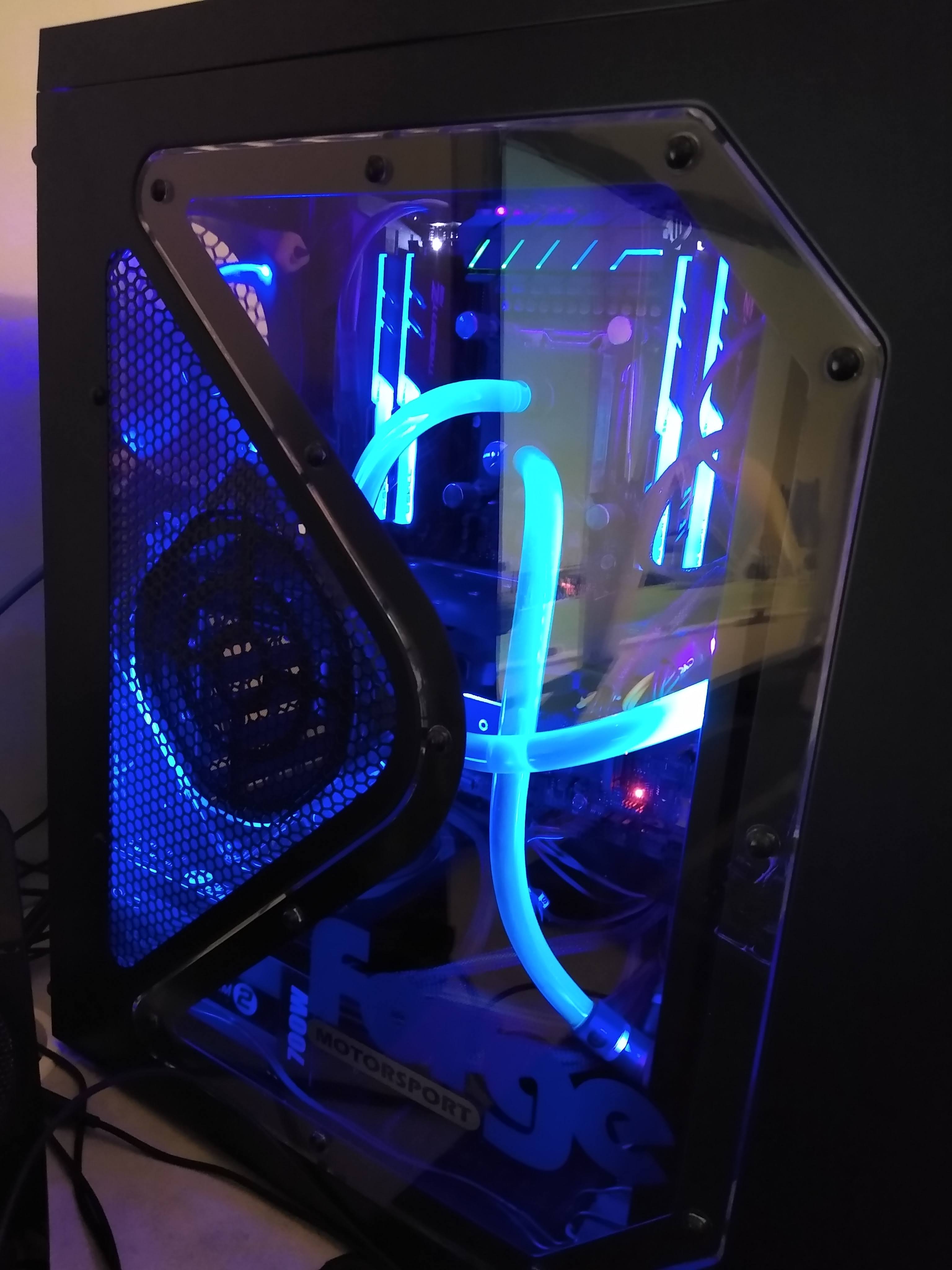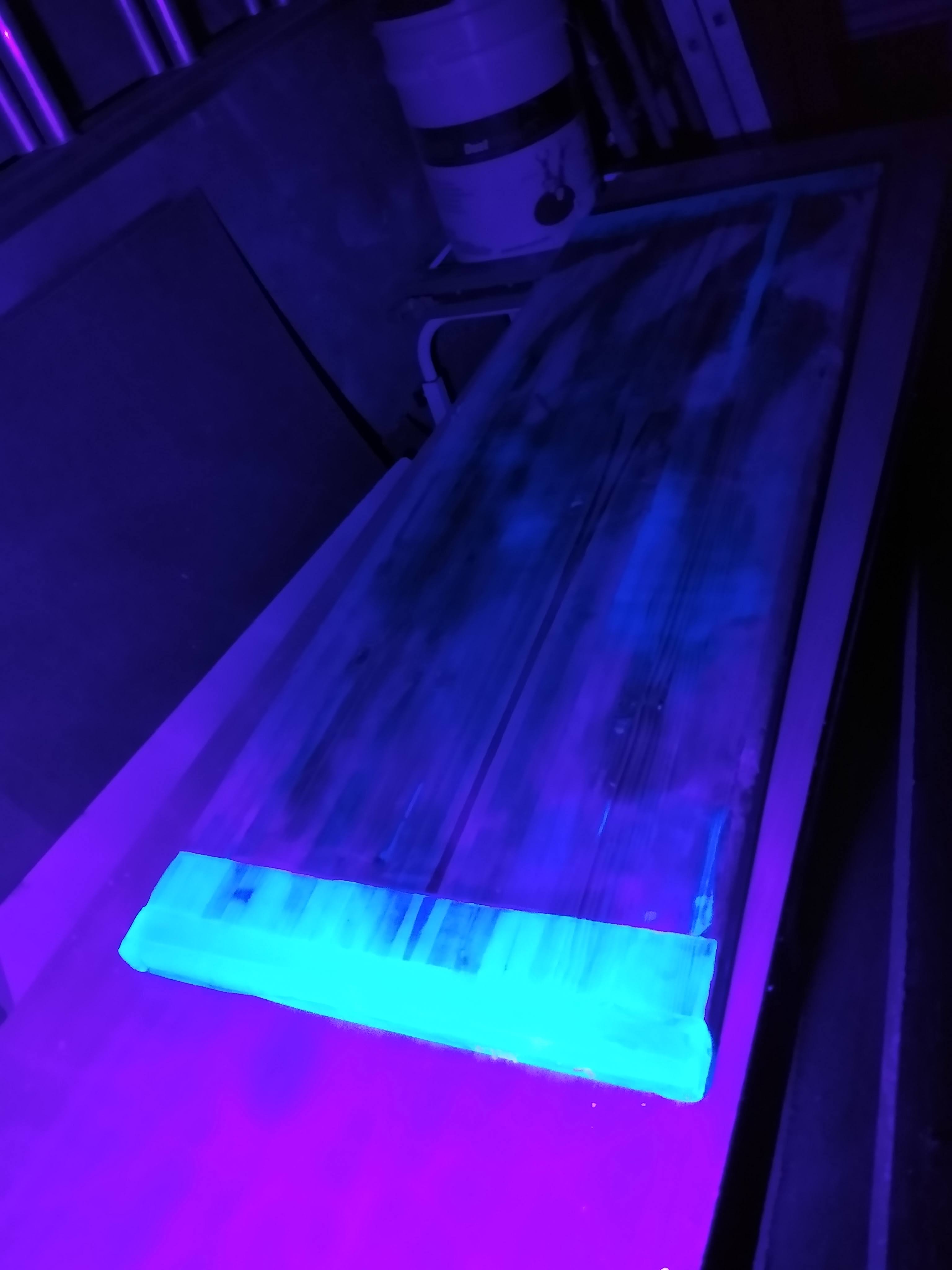 Step 12: Re-pour the new epoxy and wait for it to cure. It was still very cold but I made sure to warm the resin a little before mixing and put on a heater in the garage to take the edge off the cold. This seemed to work fine and cured rock solid. For absolutely no reason I had added some UV dye that I had left from a water-cooled PC build. It seemed to still be pretty reactive to UV even though it was 4 years old. Now it kind of matches the PC, and it sparked an idea for a full-size desk. A full-size desk with a UV inlay has been placed on my laterbase.