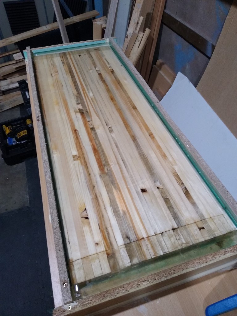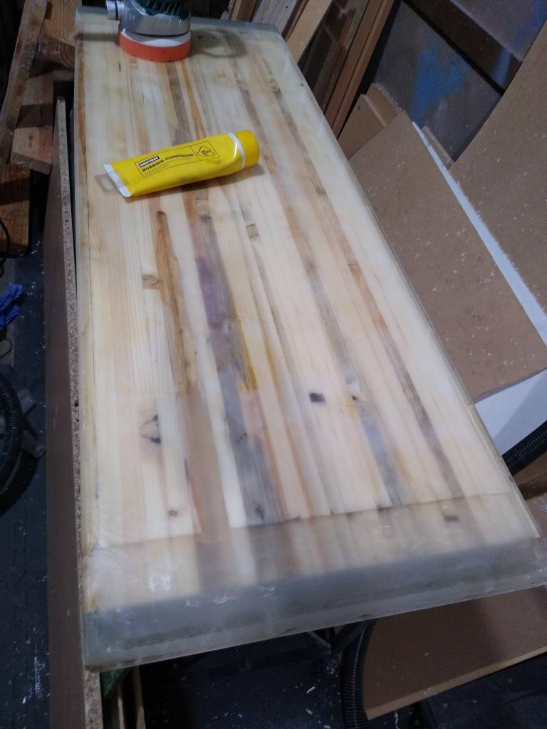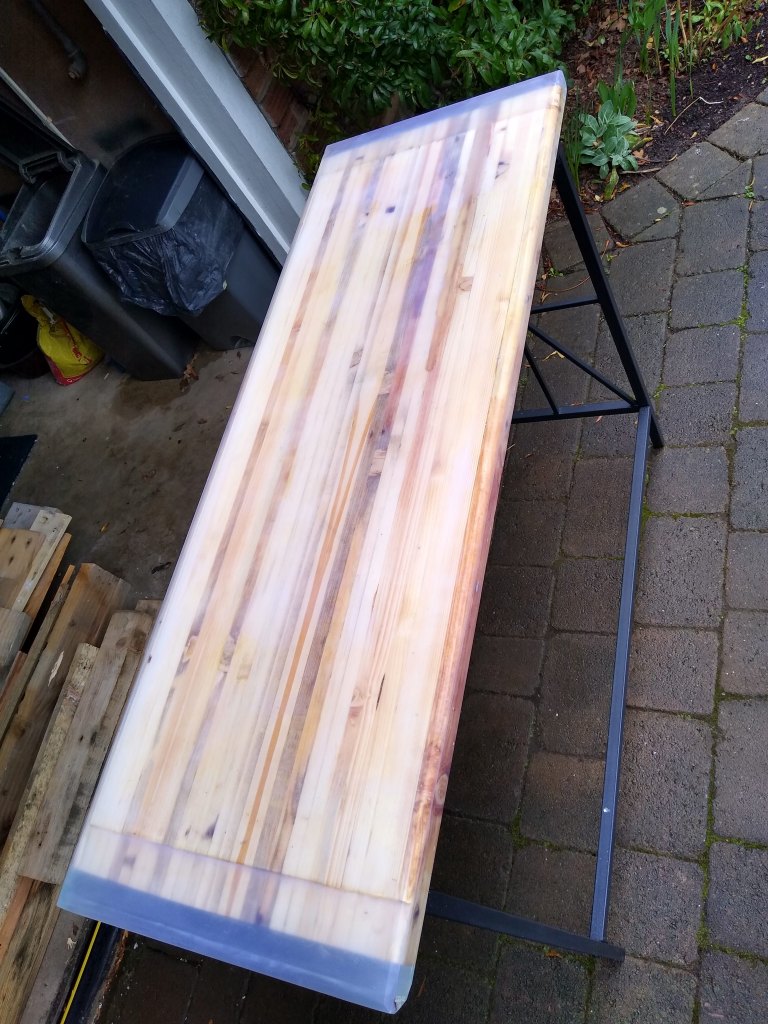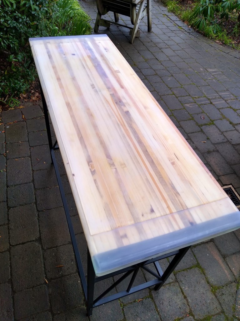 Then I plonked the table top back inside the form and to my amazement, it fitted perfectly, with a slight gap on each side to allow the resin to encase it. I thoroughly mixed the resin then poured it in the form and once again crossed my fingers.