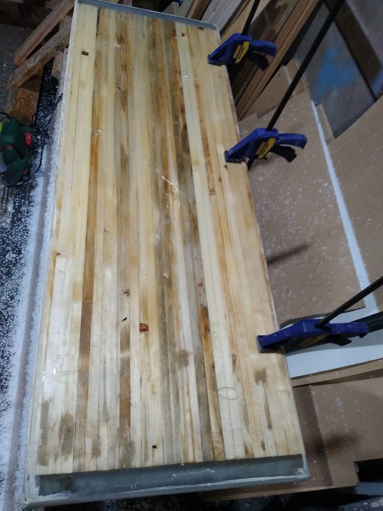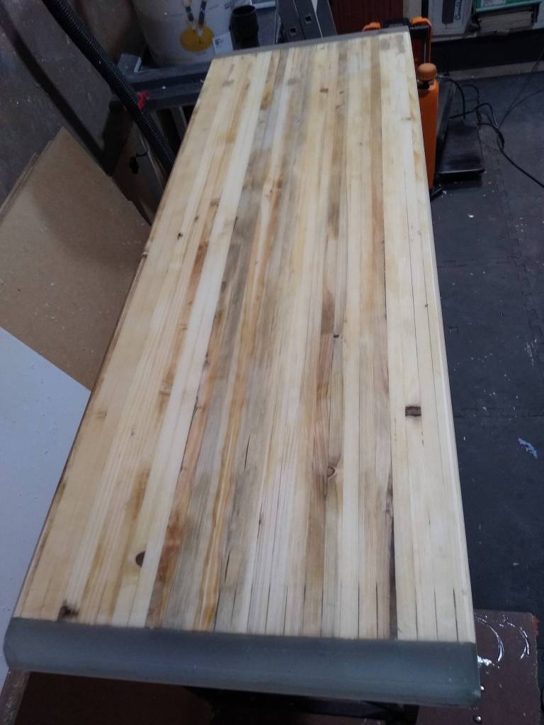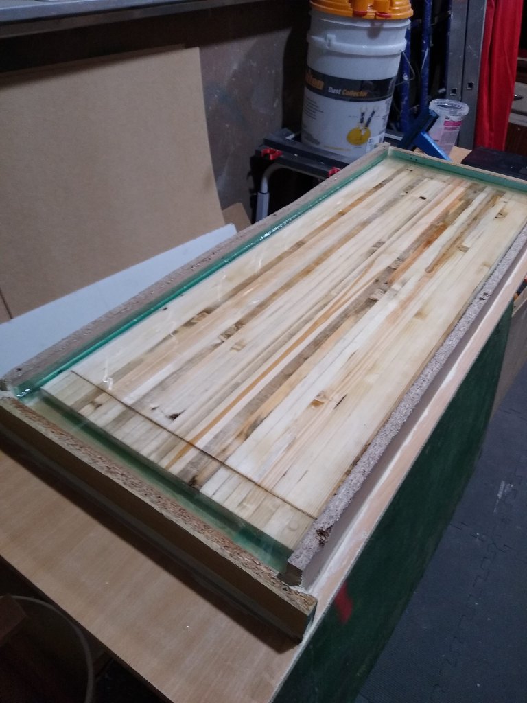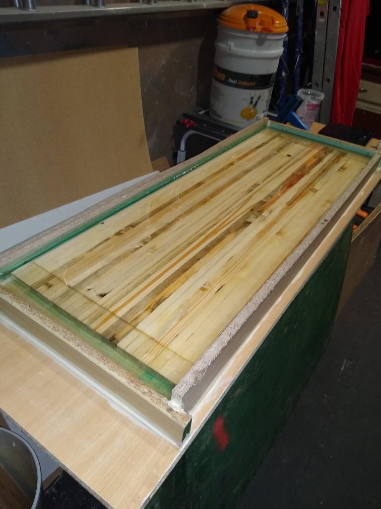 Then I plonked the table top back inside the form and to my amazement, it fitted perfectly, with a slight gap on each side to allow the resin to encase it. I thoroughly mixed the resin then poured it in the form and once again crossed my fingers.