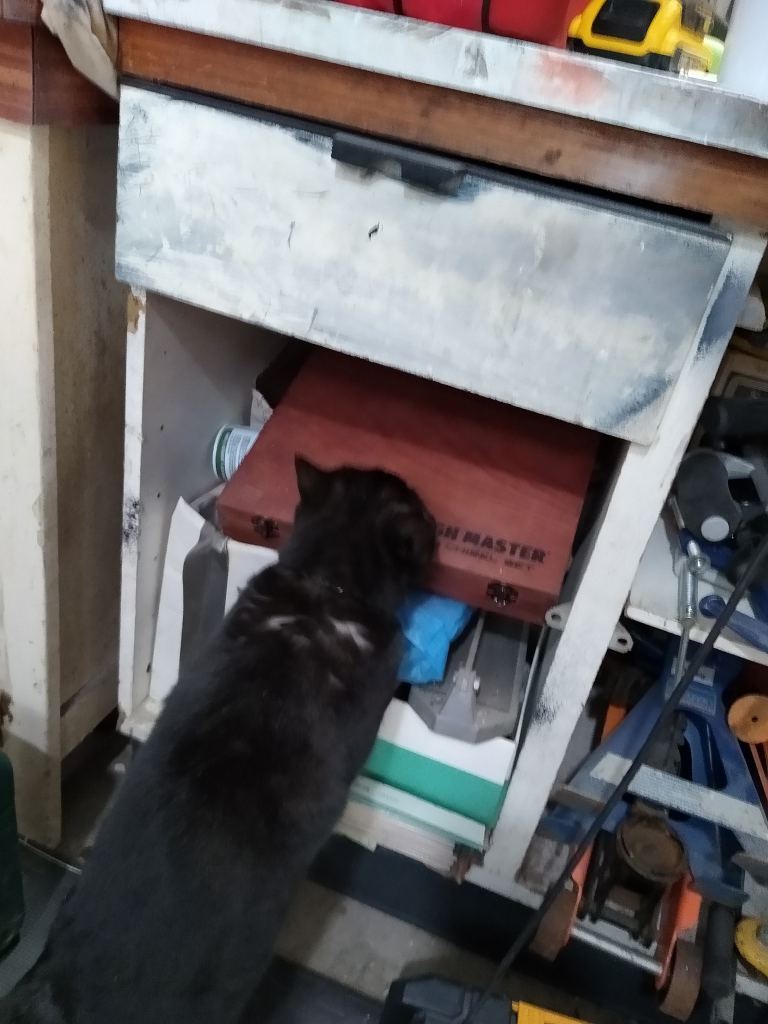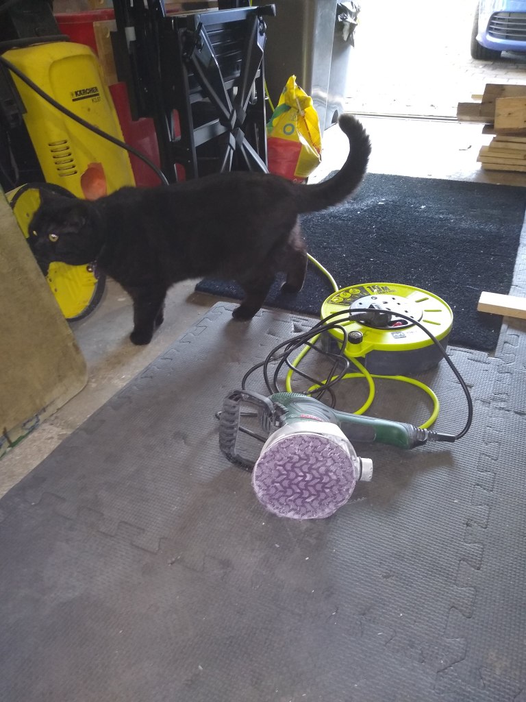 Step 18: After some sanding advice from a cat, I landed on a frosty finish on the epoxy to mask the bubbles, milky haze, embedded caulk & other unwelcomed bits. Originally this was going to be a glassy clear top but experimenting with sanding grits, polished and waxes proved to be enlightening.