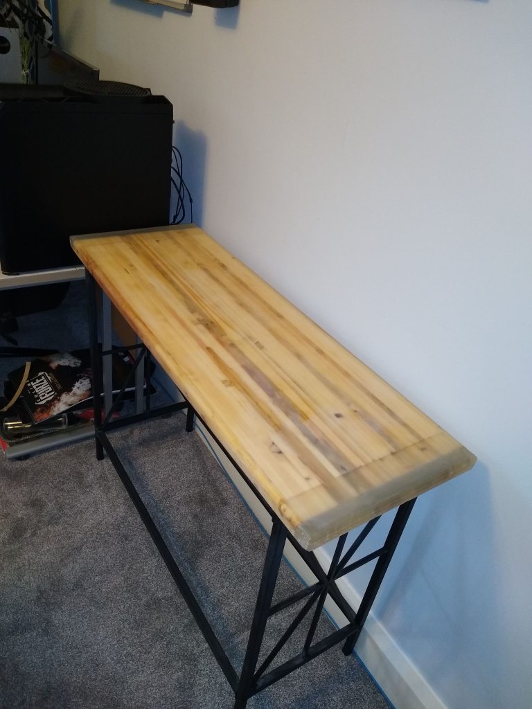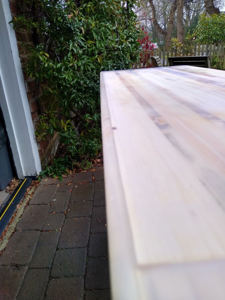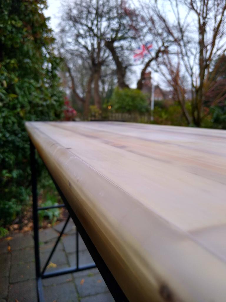 I used the sander and went through grits 80, 120, 180 and 320 , this left a uniform and frosted look. Then I attempted to buff it with an automotive cutting compound that I found in the back of a cupboard. This actually seemed to work and gave a smooth and slightly clearer finish. After little to no research I decided to use a B&Q basic mat furniture wax to finish the table. It looks like Rubio mono-coat is often used but that stuff is too expensive for this experiment.