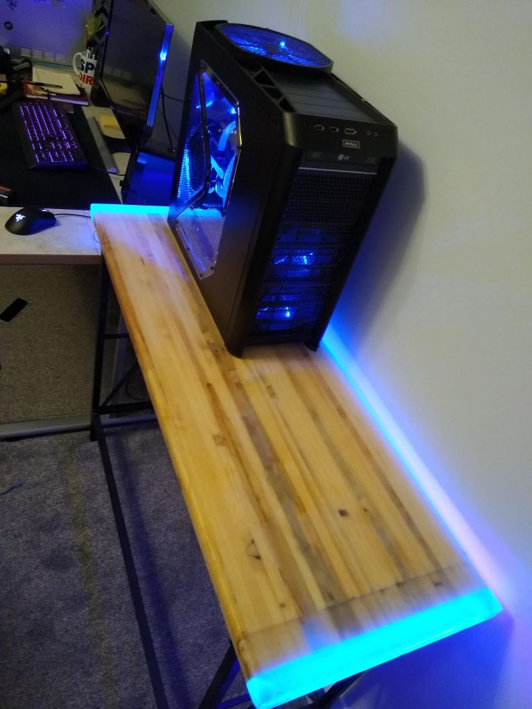 Step 19: The final part of this weird table project was to find a way to make it glow with that UV goodness. Turns out that UV strip lighting is readily available and pretty cheap. I wanted the UV light source to be out of sight and shine up though the ends of the table. To get the best light coverage, the LEDs needed to be angled upwards so I printed some 45-degree angled brackets. These could be installed under the table and the black filament matched the table frame so it’s barely noticeable unless you’re looking for it. The UV light strip is powered by USB, so plugging it into my PC means it powers up and down with the PC.