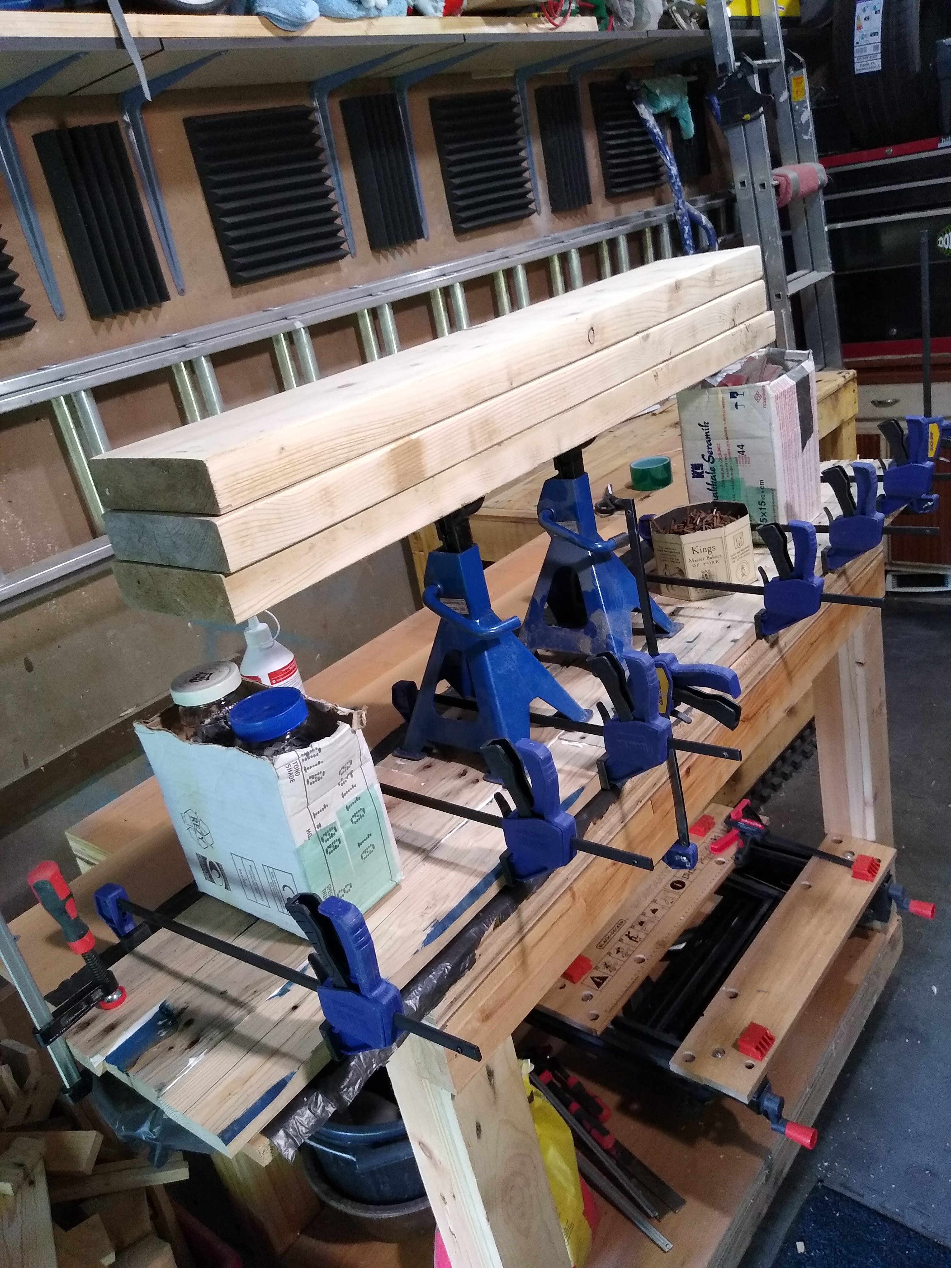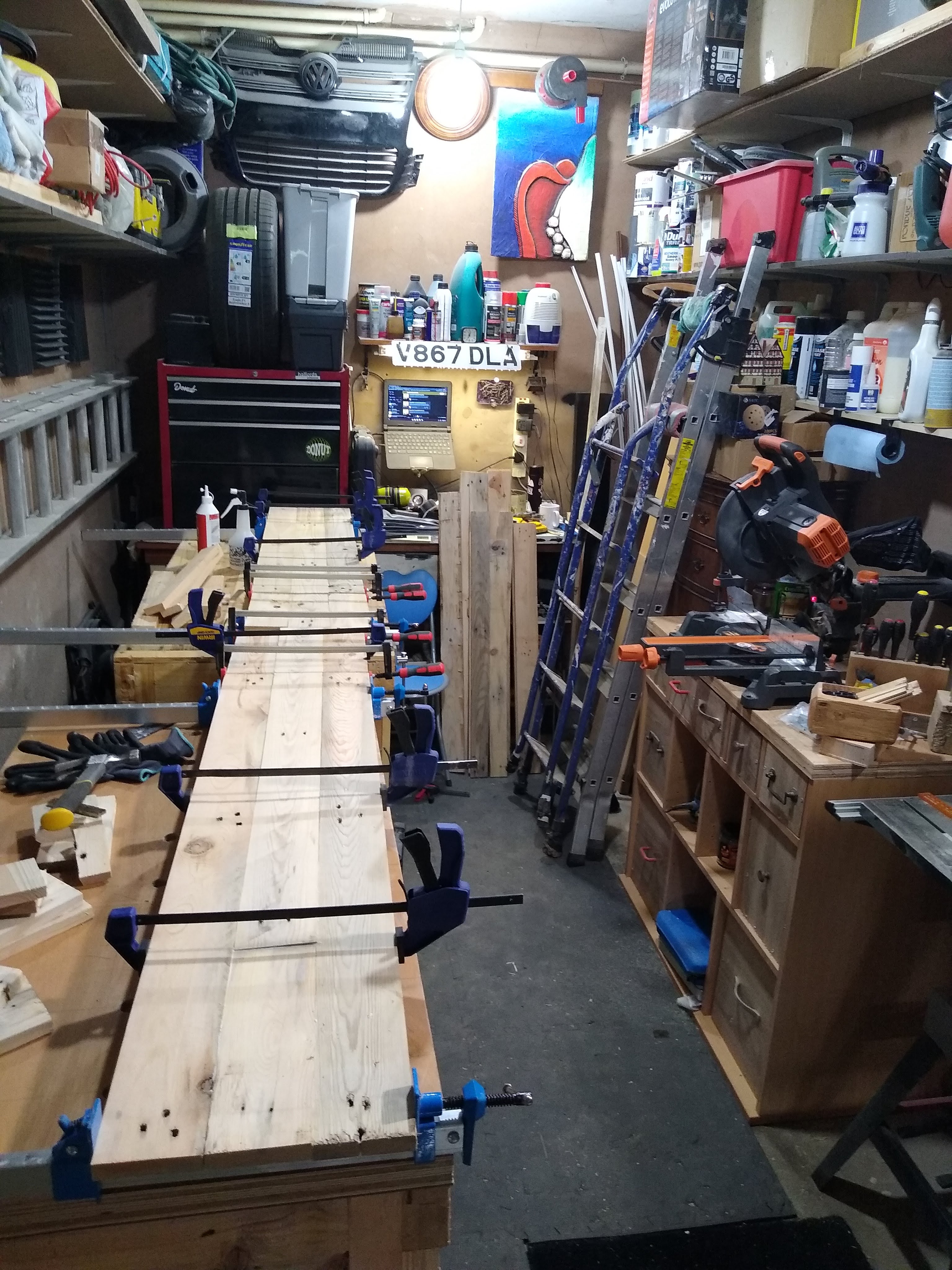 For the bigger bed I glued up the sides and added the corner braces but the final assemble would be done on site as my golf was too small to fit an assembled bed of that size! A couple of the boards where a little bowed so I piled a bunch of weighty things on top and clamped it to the bench whilst the glue was curing. Ended up looking like an odd Buckeroo/Jenga game