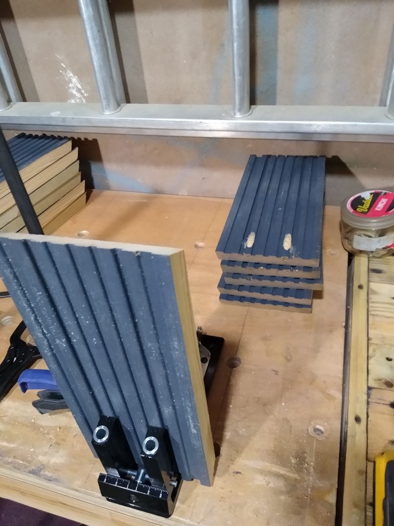 I discovered that my mitre saw was missing the angle gauge sticker so had to get hold of one from evolution. Took a little while to get the perfect 30 degree set on then after having a few angle issues with a misaligned mitre-saw gauge I eventually got the correct angle. The end result was 4 piles of symmetrical boards:
