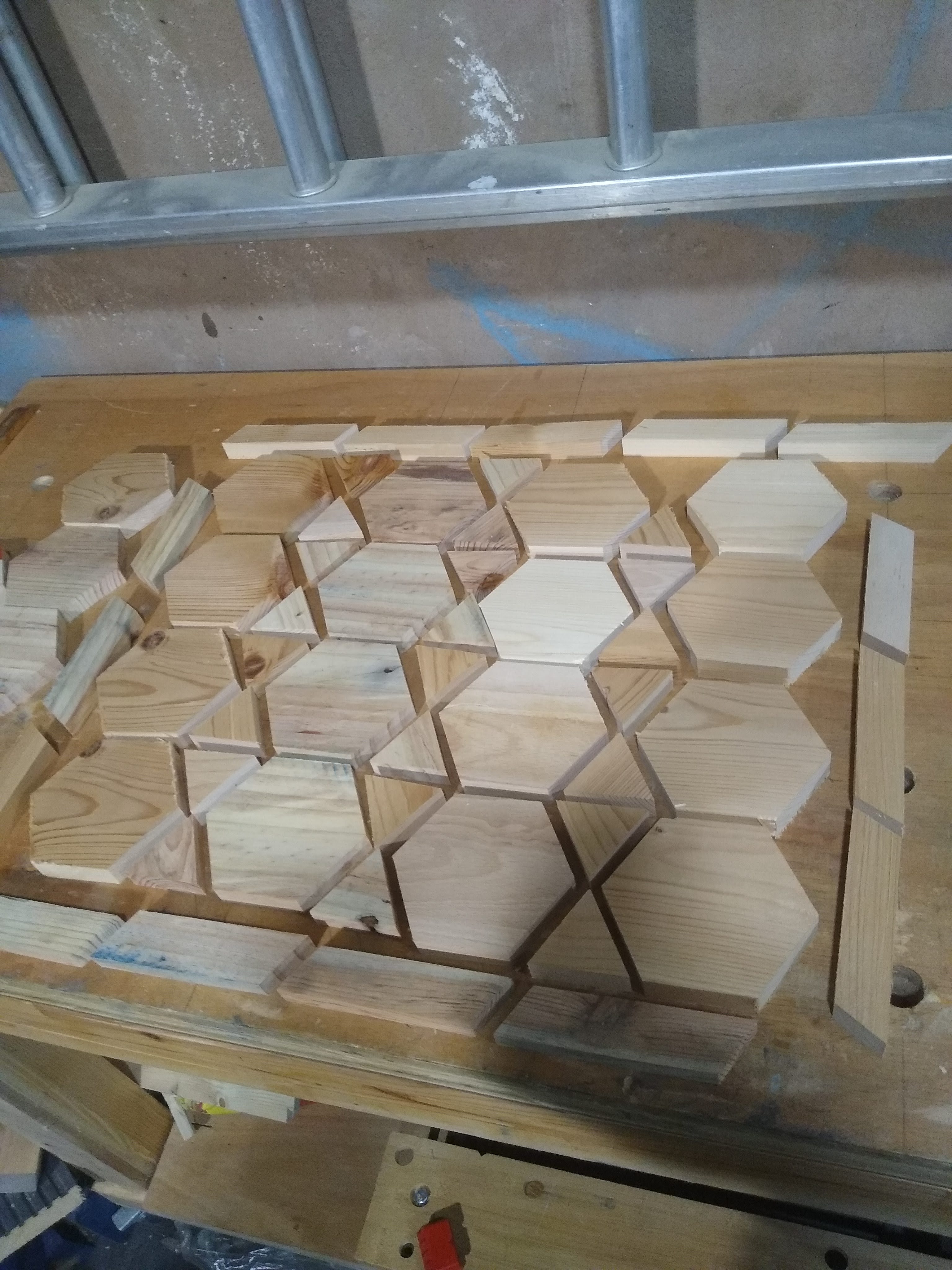 Start hexagon production! My initial thought was to use purely pallet wood for this but I soon ran out of my dry stock and didn’t want to dismantle fresh (potentially wet) pallets. I ended up buying a couple of planks of redwood PSE from wicks. This is the first wood I’ve actually bought, I must admit not needing to remove nails, joint edges and sand each plank was a nice change!