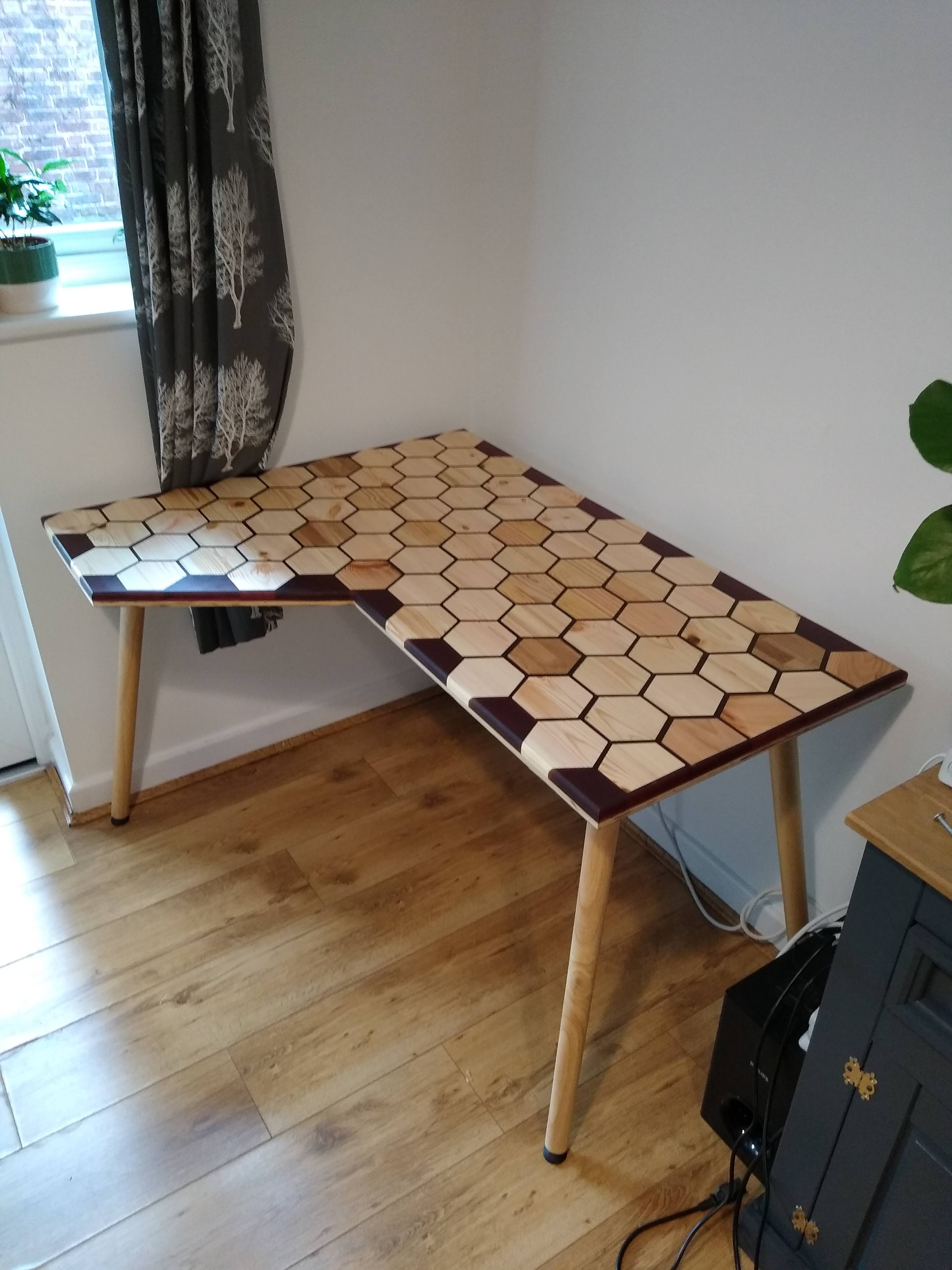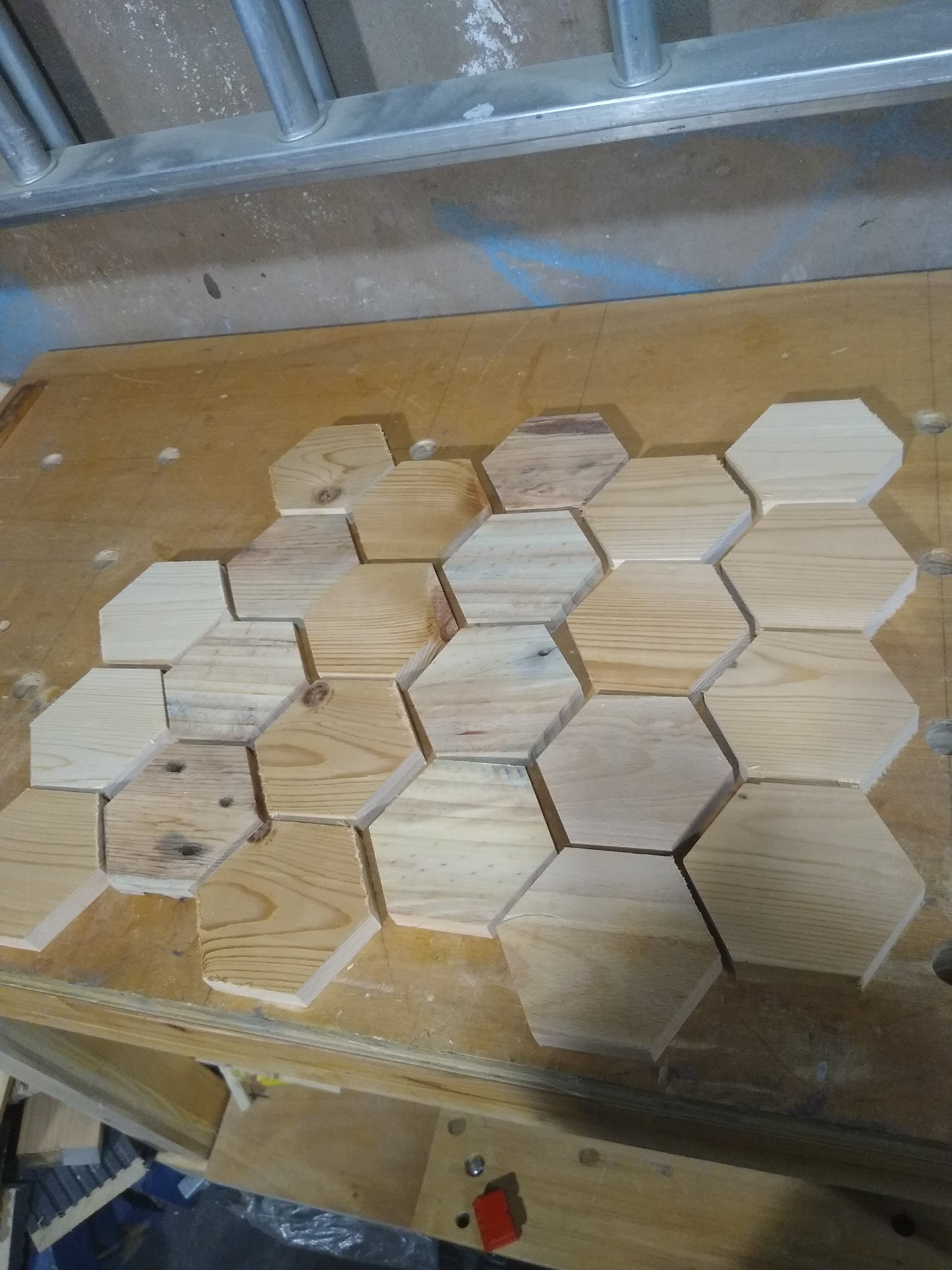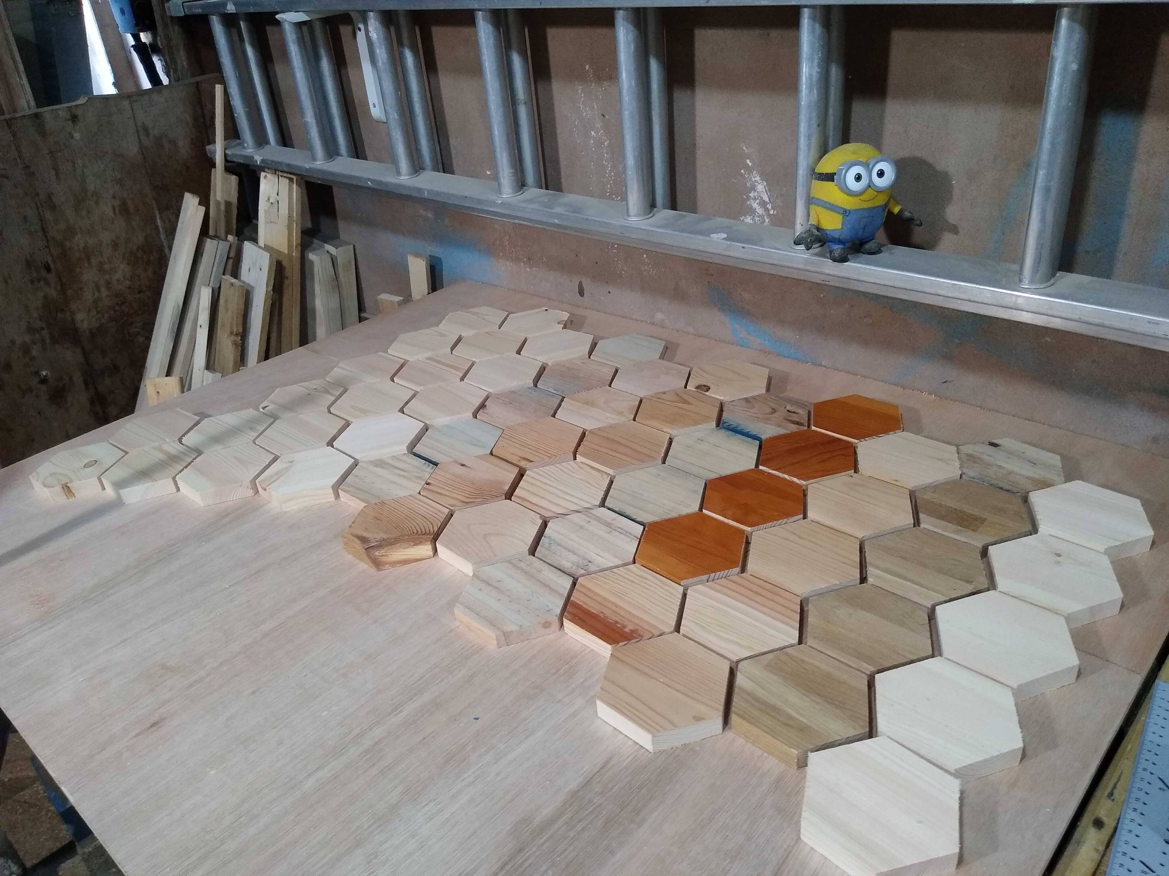 I played around with patterns for a while as I had many different types of wood, in the end I decide a more randomised pattern would be best as I didn’t have enough of each type to have a consistent pattern. Making sure the grain direction was the same on each hexagon but distributing the darker woods gave a nice effect.