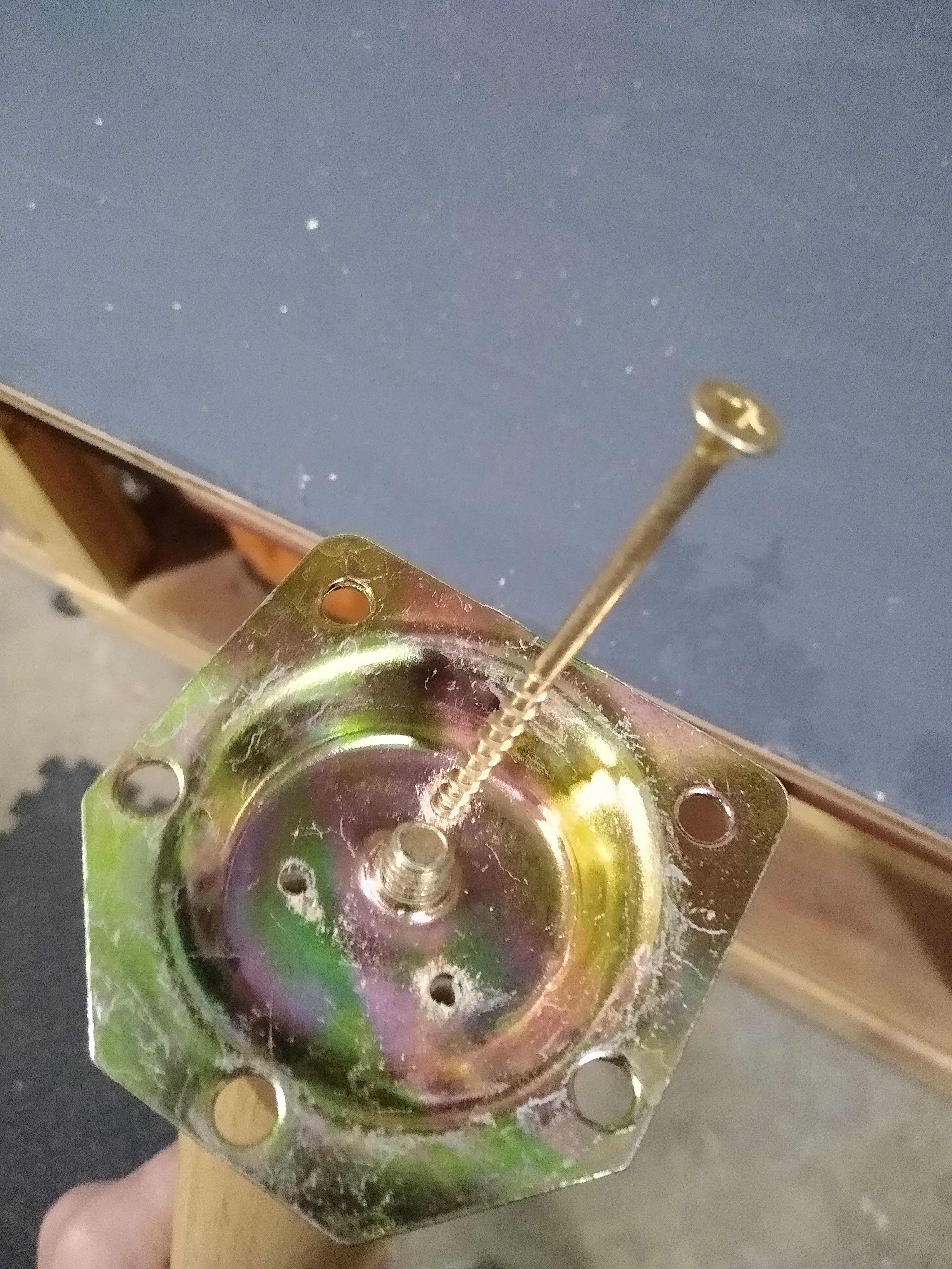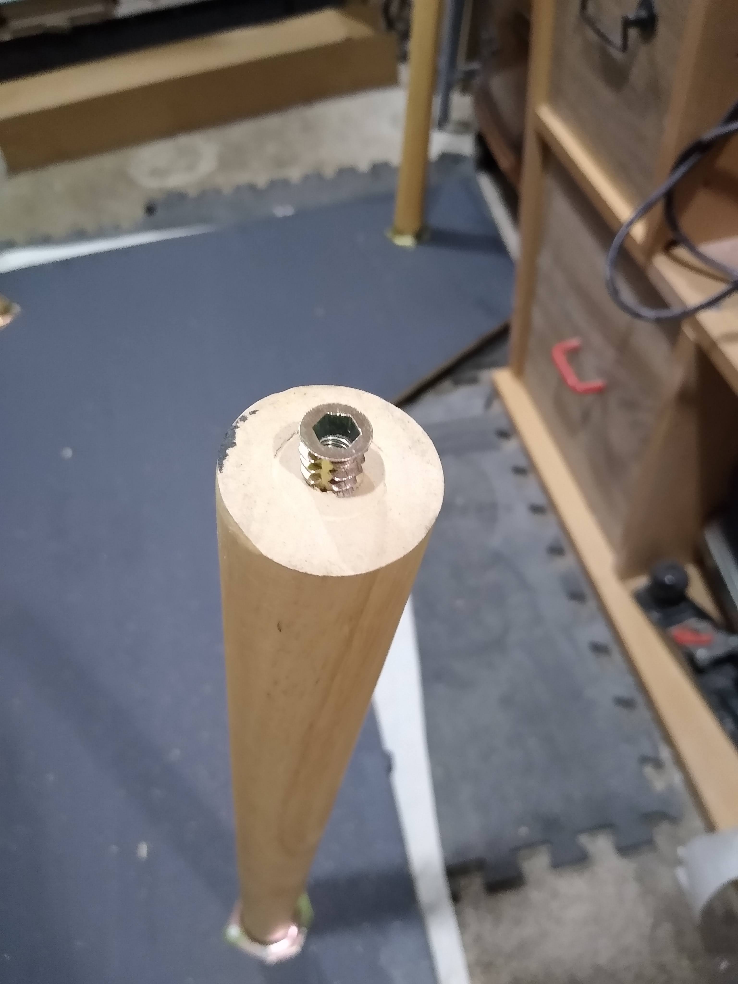 Spend far too long deciding what legs to use. I almost went for some shaped black steel legs but in the end I thought it wouldn’t suit the design so I opted for wooden pins at a slight angle on each corner. The legs are a light oak which looks great but the sadly the mounting system is not very stable so I had to re-enforce them with some 4 inch wood screws going straight though the bracket. I added some adjustable feet that attached via a threaded insert that I installed.