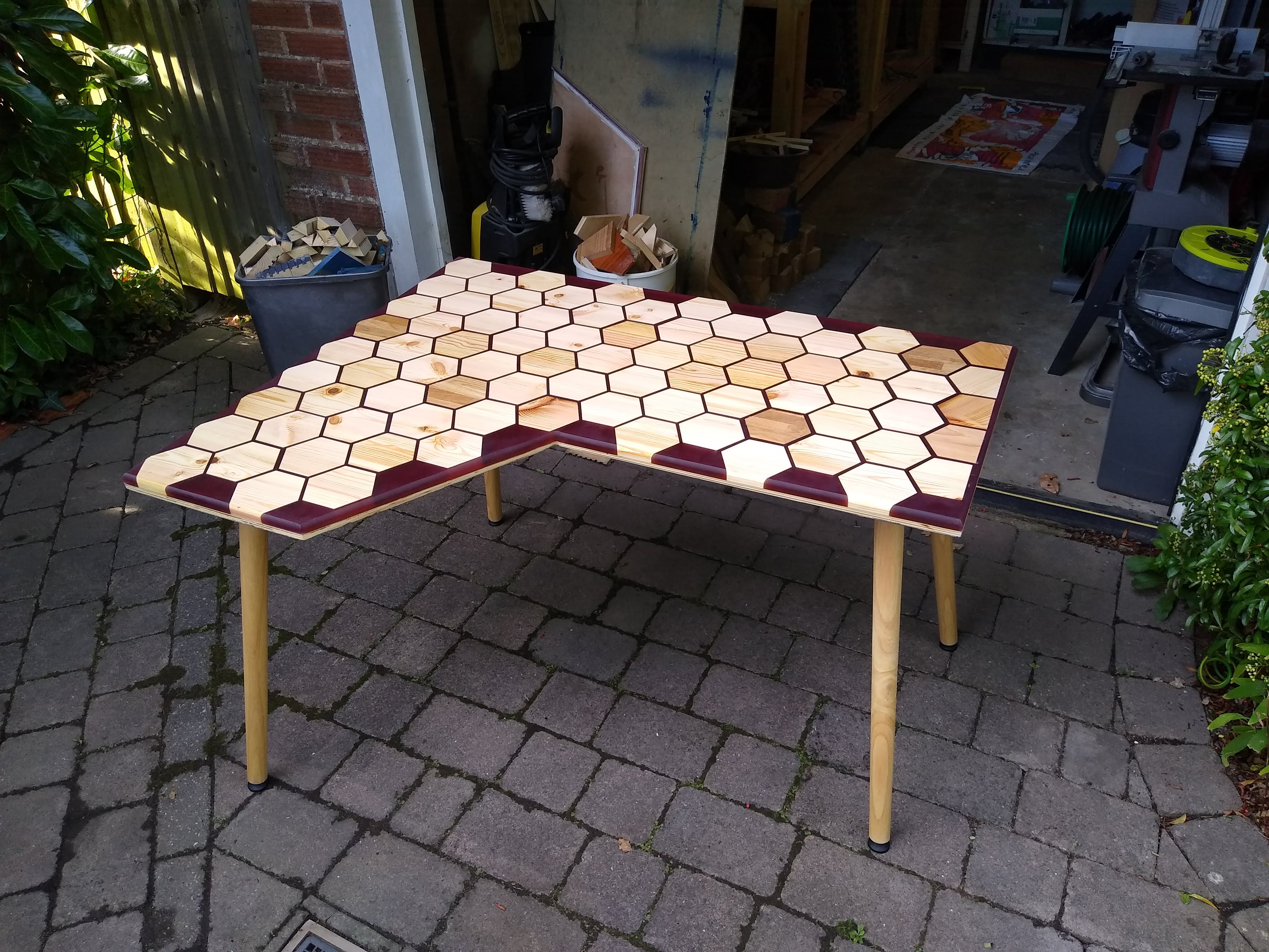 Make a mini prototype to prove that the concept was sound-ish. A rough approach was as follows, make hexagons, make a form, put hexagons in form, pour epoxy in form then sand/plane off excess. Sounds simple enough but I wanted to try it out first. It was worth while spending the time on it as I learnt a few things: