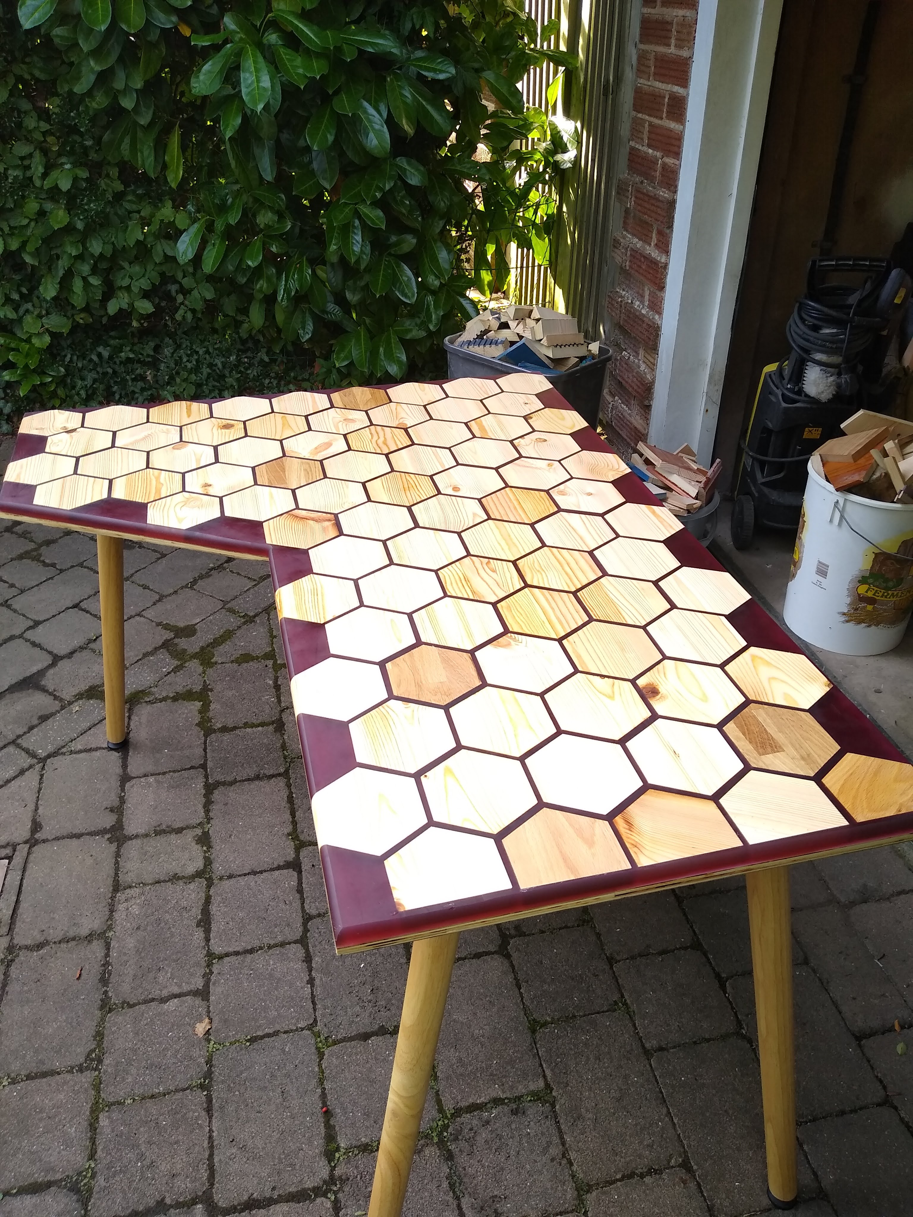 After finalizing the pattern I built a form on top of some 12mm hardwood plywood and started to glue down the hexagons with 2-part activated glue. The glue was great as it cured immediately so there was no need for 100’s of clamps on each hexagon. Once this step was complete you could really see what the table could end up looking like.